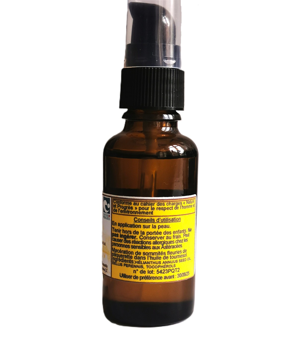 Ingrédients : Fleurs de pâquerettes du jardin de l'abbaye, macérées dans de l'huile de tournesol.