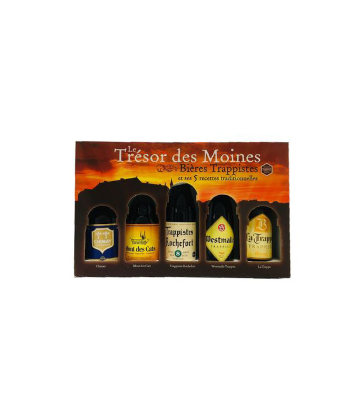 Beau coffret rassemblant 5 bières de trappistes différentes.