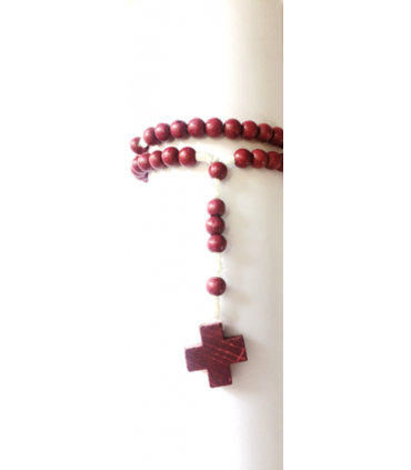 Chapelet en bois bordeaux avec une petite croix et des nœuds en blanc