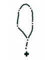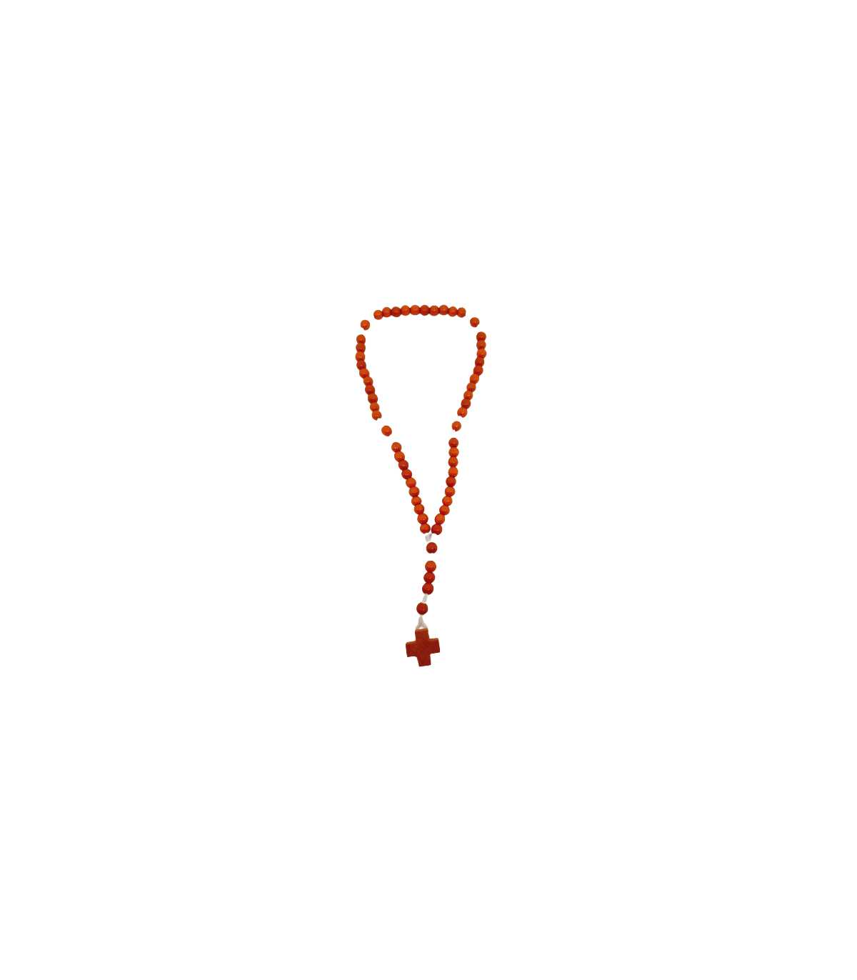 Chapelet en bois rose avec une petite croix et des nœuds en blanc