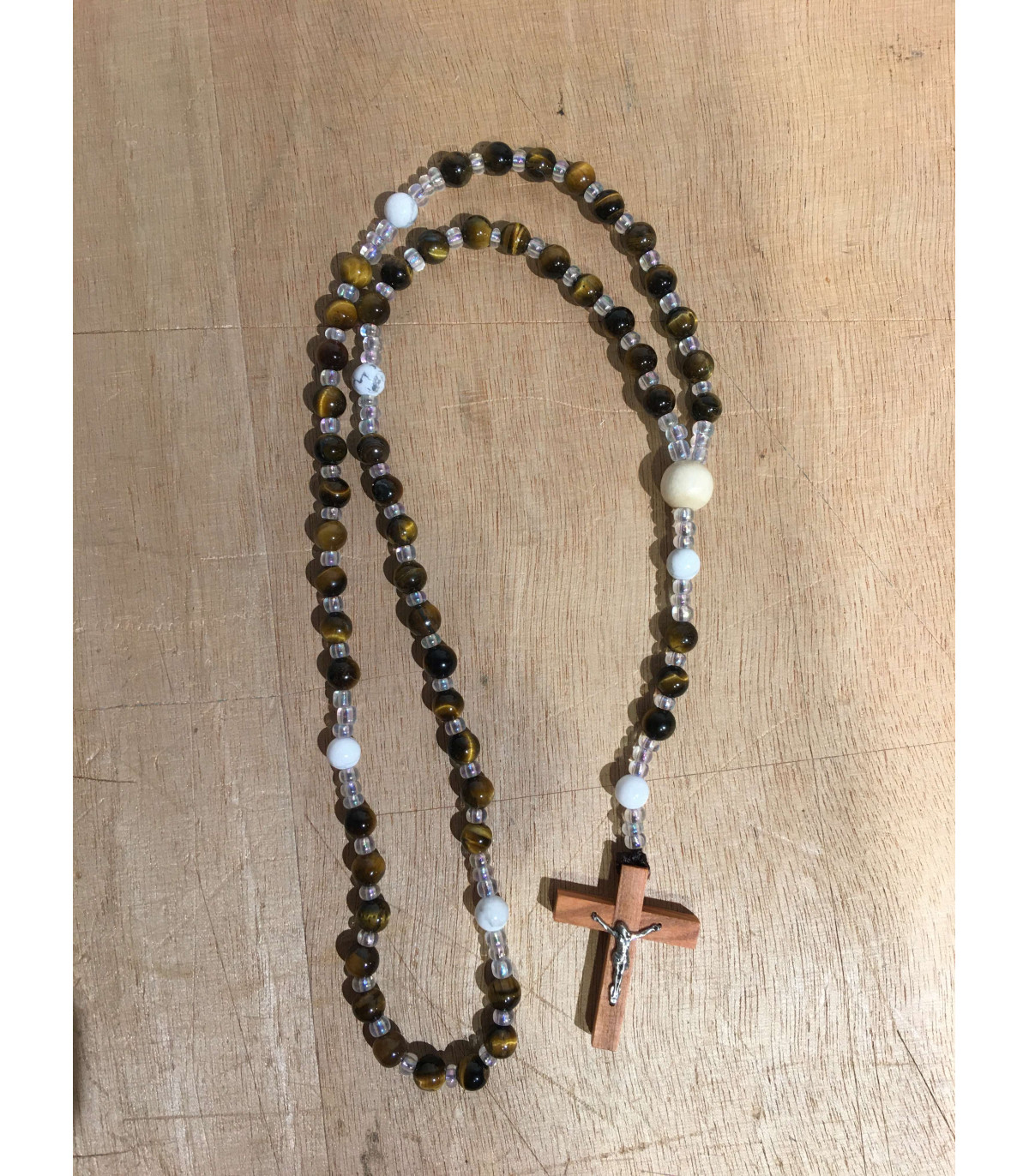 Chapelet en pierres semi-précieuses rhodonite rose/apatite bleue/jaspe rouge/fluorine/sodalite/howlite/oeil de tigre - Carmel d'Avranches