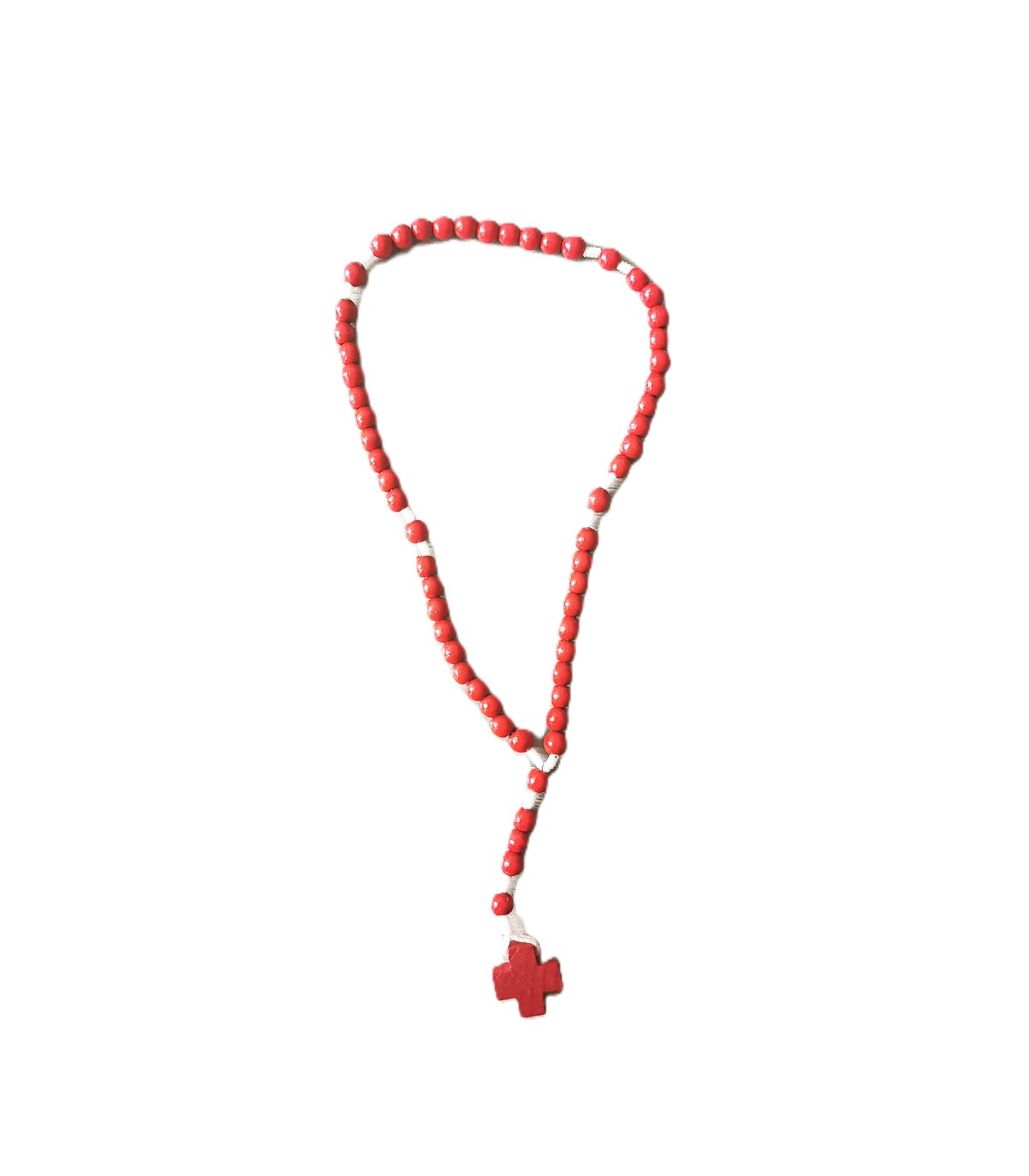Chapelet en bois rouge avec une petite croix et des nœuds en blanc