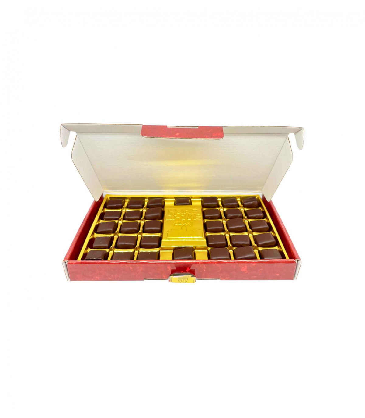Ingrédients: pulpe de fruit (susceptible de contenir des fragments de pépins) (33.5%), sucre (33.5%), sirop de glucose (6.7%), pectine de pomme (0.9%), acide citrique (0.2%), amidon de pomme de terre, chocolat de couverture à 60% de cacao (25%) contenant lécithine soja (E322).