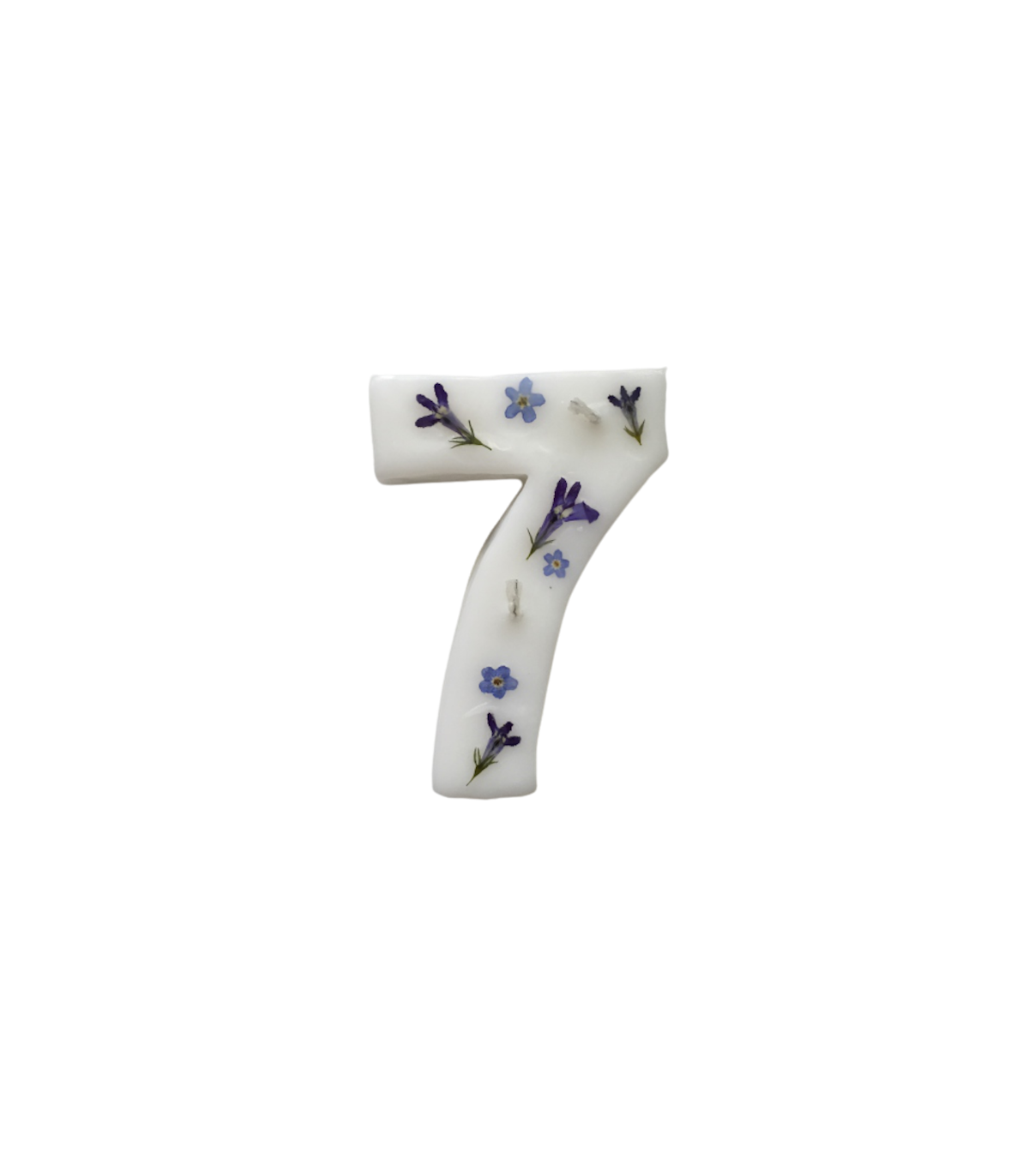 Bougie chiffrée, décorée avec des fleurs véritables séchées.