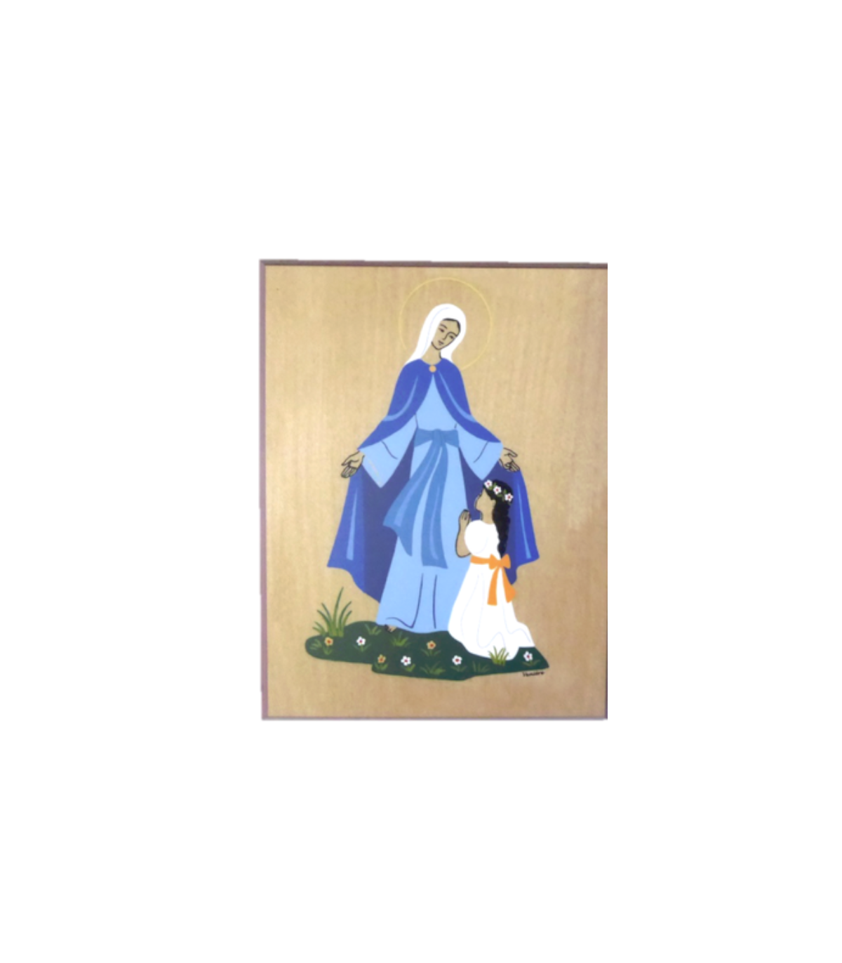 Les Sœurs de Venière vous propose une très belle peinture sur bois laminé, représentant Marie. Au verso se trouve une courte prière, et une attache murale.