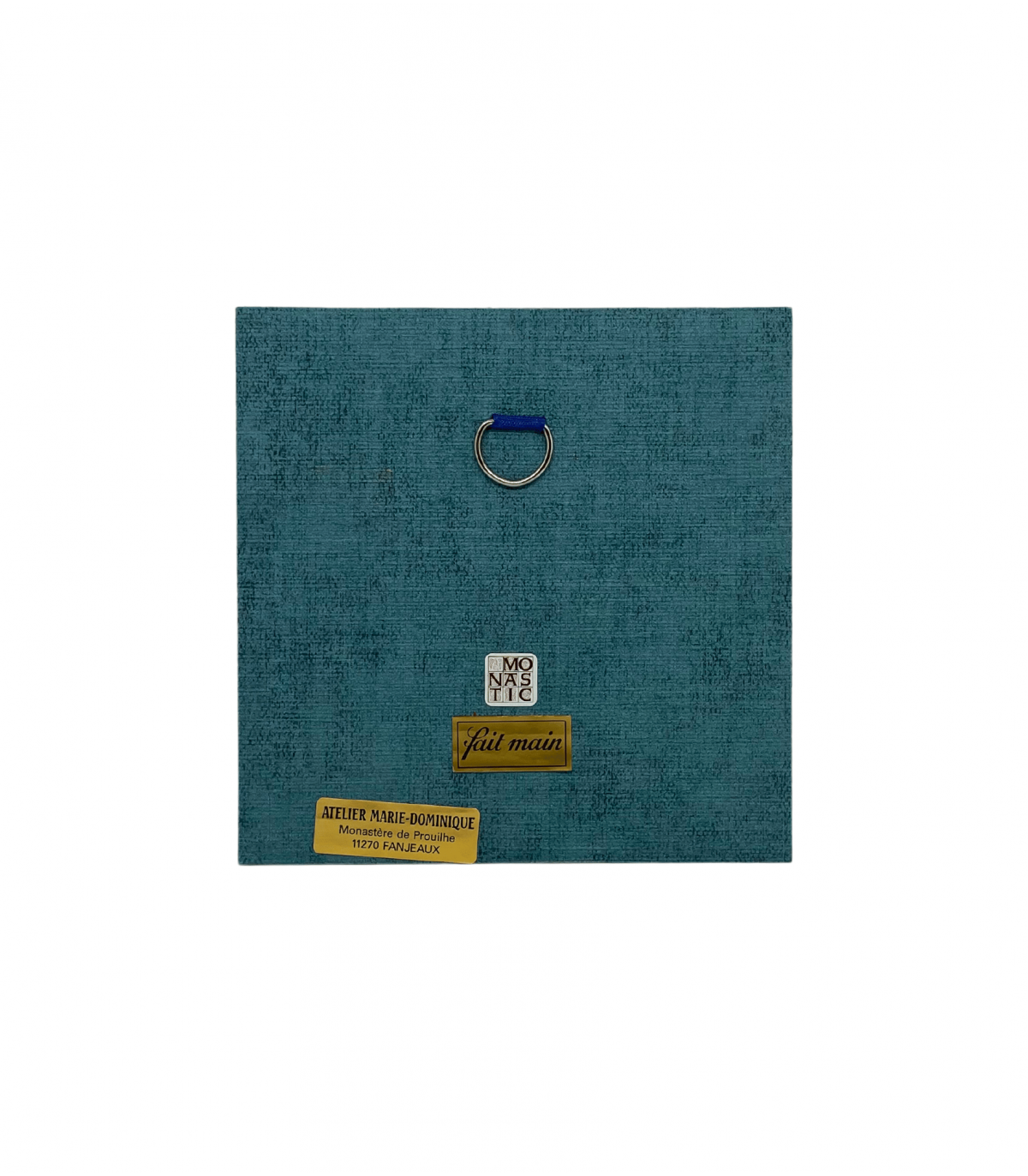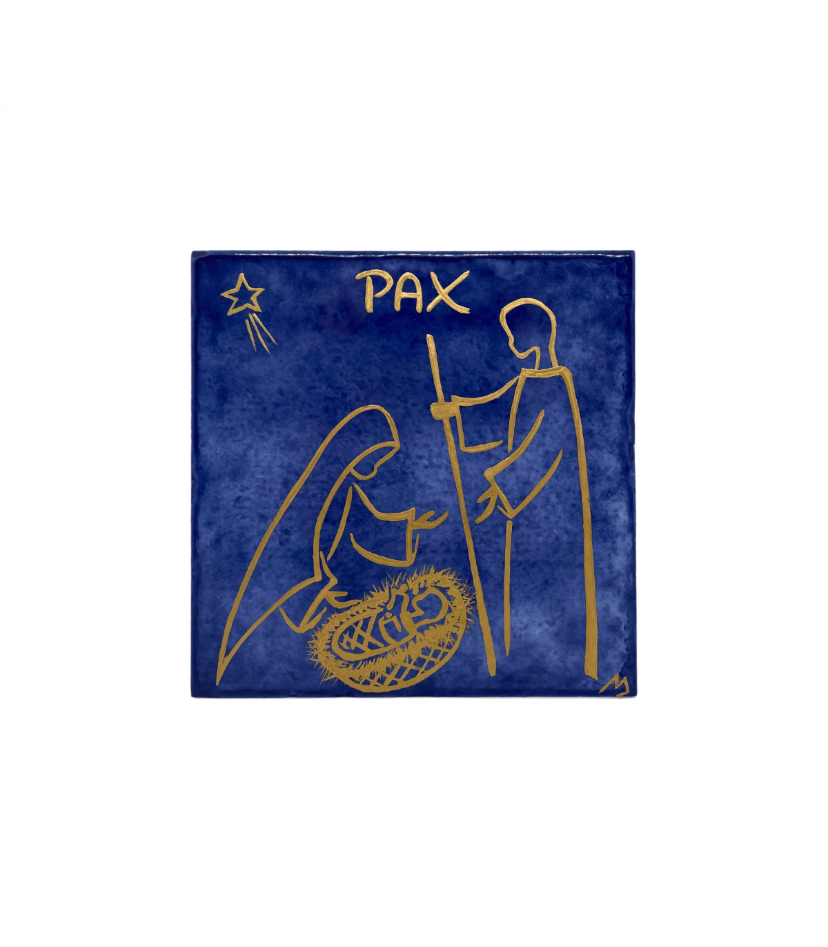 Plaque murale ND Pax Or (15*15 cm), en céramique peinte à la main à partir de modèles créés par l’Atelier Marie-Dominique. Depuis 1960.