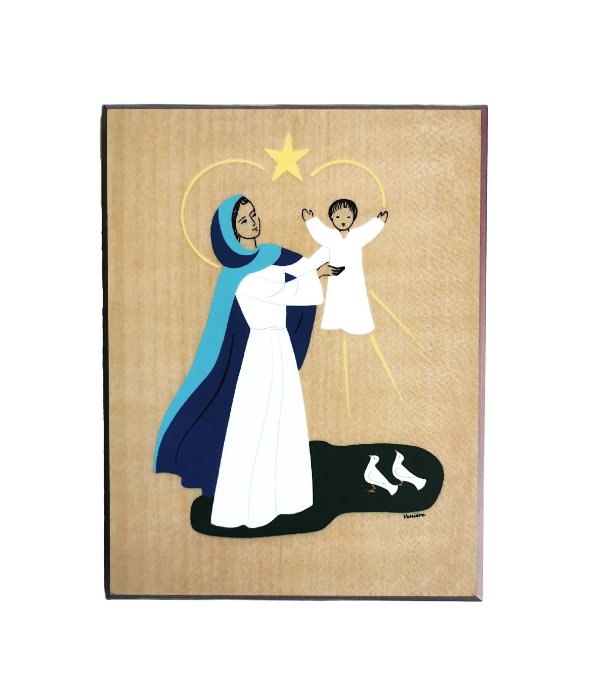 Marie y est représentée les bras ouverts, cœur tourné vers Dieu, accueillant chacun dans sa lumière maternelle. Une présence douce et forte, idéale pour accompagner un coin prière, offrir en temps d’épreuve ou simplement rappeler, au quotidien, que la lumière divine passe par le cœur de la Vierge.