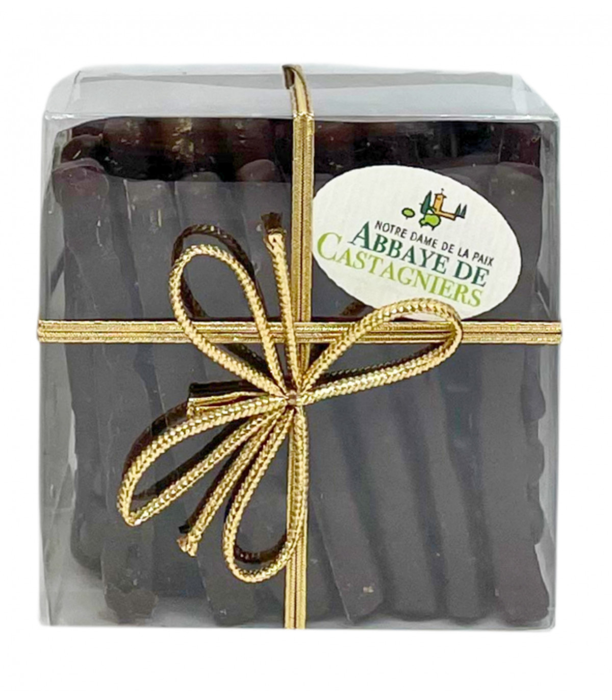 Délicieuses orangettes de l'abbaye de Castagniers. 100g Ingrédients: écorces d'oranges confites, sirop de glucose, sucre, poudre de cacao, correcteur d'acidité E501i. Chocolat noir 70% min de cacao, sucre, pâte de cacao, beurre de cacao, lécithine de soja. Peut contenir du lait et des traces de fruits à coques.