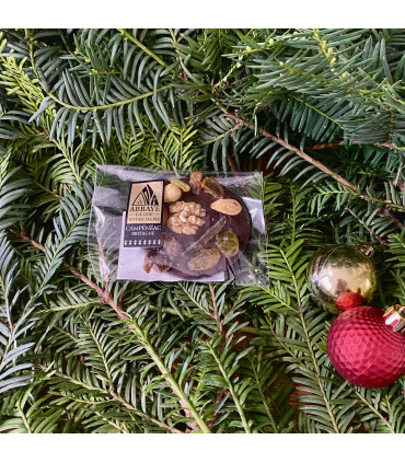 Ingrédients : chocolat noir 57 % de cacao, pur beurre de cacao, cerneau de noix, noisettes, amandes, raisins secs, arachides, écorce d'orange confite, pistaches.