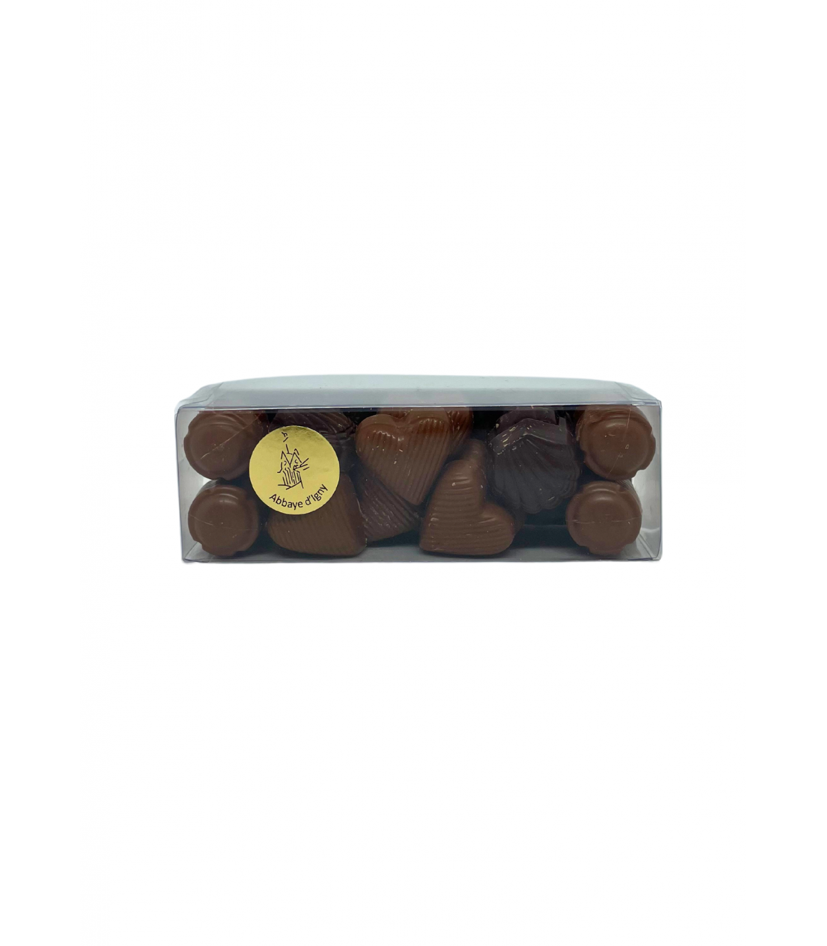 Petit Bouchon d'Igny ( chocolat au lait 34% de cacao, avec un fourrage praliné) et petits sujet (chocolat lait 34% de cacao et noir 55% de cacao)