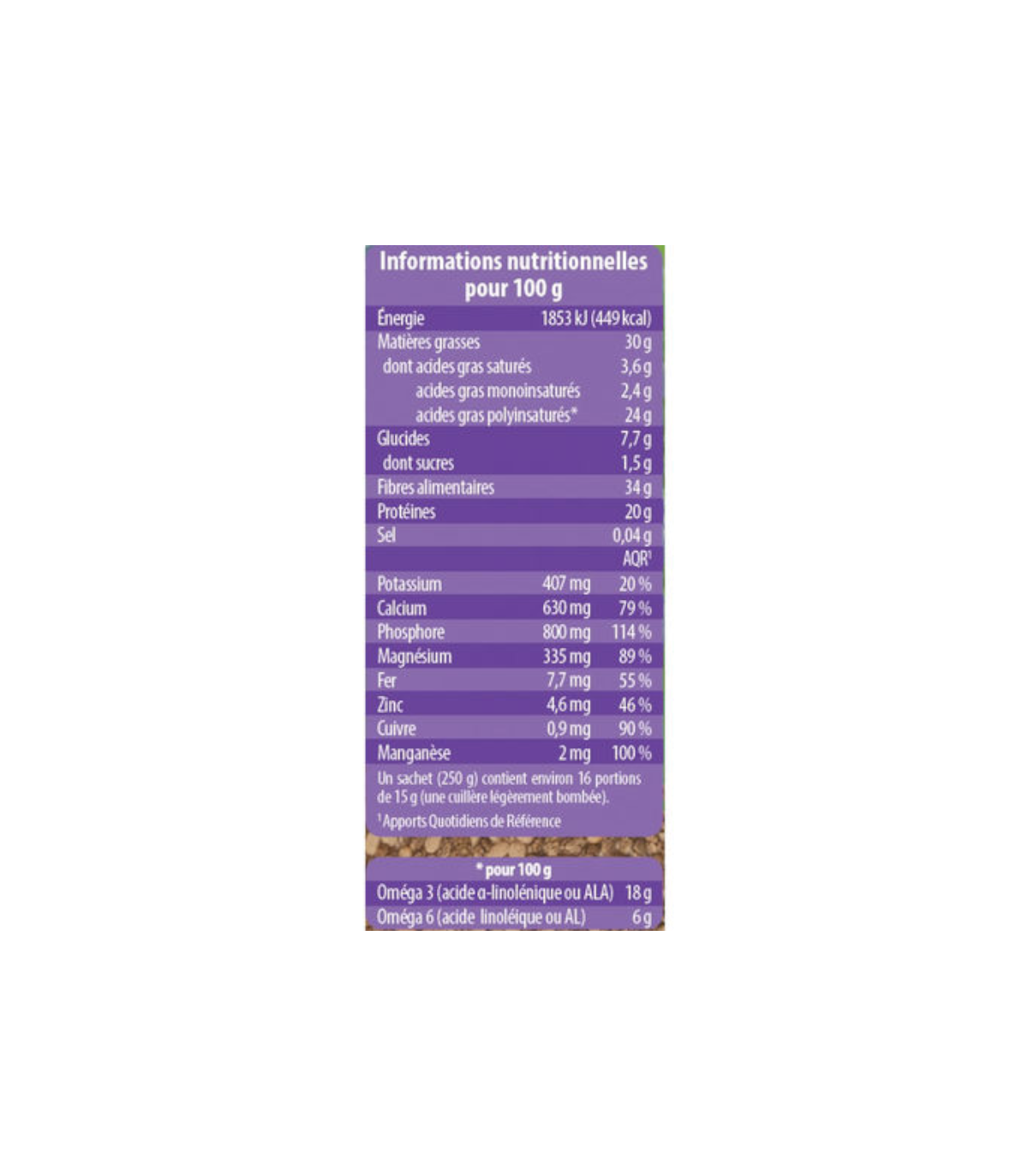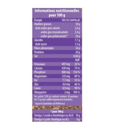 Riches en fibre, en AGPI (acides gras polyinsaturés), en Oméga-3, Oméga-6, en calcium, en fer, en phosphore, magnésium, zinc, cuivre et manganèse.