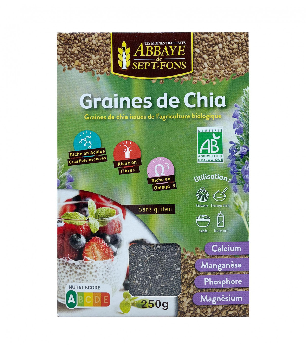 Graines de chia bio conditionnées par les moines trappistes de l'Abbaye Notre-Dame de Sept-Fons