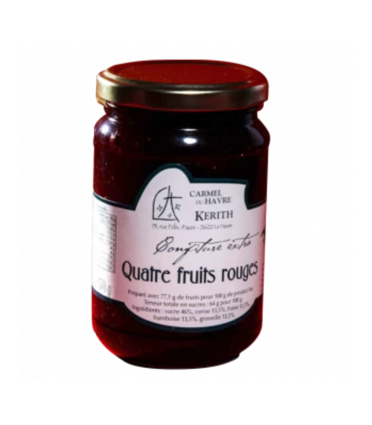Confiture extra de quatre fruits rouges (cerise, fraise, framboise, groseille) cuite au chaudron - Entièrement naturelle, riche en fruits