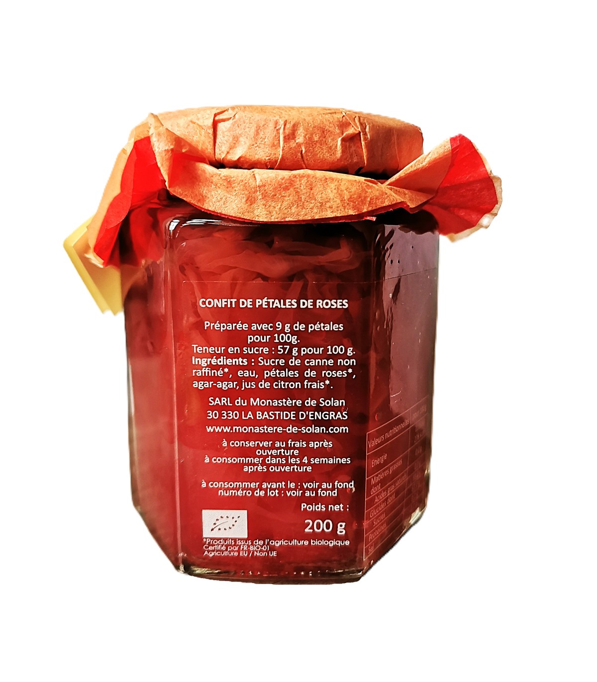 Ingrédients : Sucre de canne non raffiné*, eau, pétales de roses*, agar-agar, jus de citron frais*