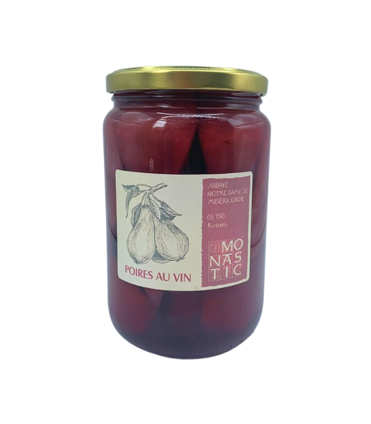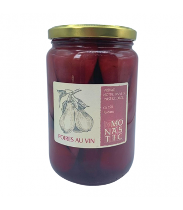Ces poires au vin sont épluchées, préparées et pasteurisées par les moniales de l’abbaye Notre-Dame de Rosans (Hautes-Alpes). Les poires utilisées proviennent de vergers d’altitude perchés entre Hautes Alpes et Drôme, dans le parc des Baronnies, elles sont de variétés conférence ou williams. Ces fruits sont un héritage naturel gardé avec passion par les producteurs, que les sœurs cuisent en bocal dans du vin des Baronnies, avec un léger sirop de sucre, qu’elles pasteurisent à 90°C, pour une conservation simple qui préserve leurs qualités.