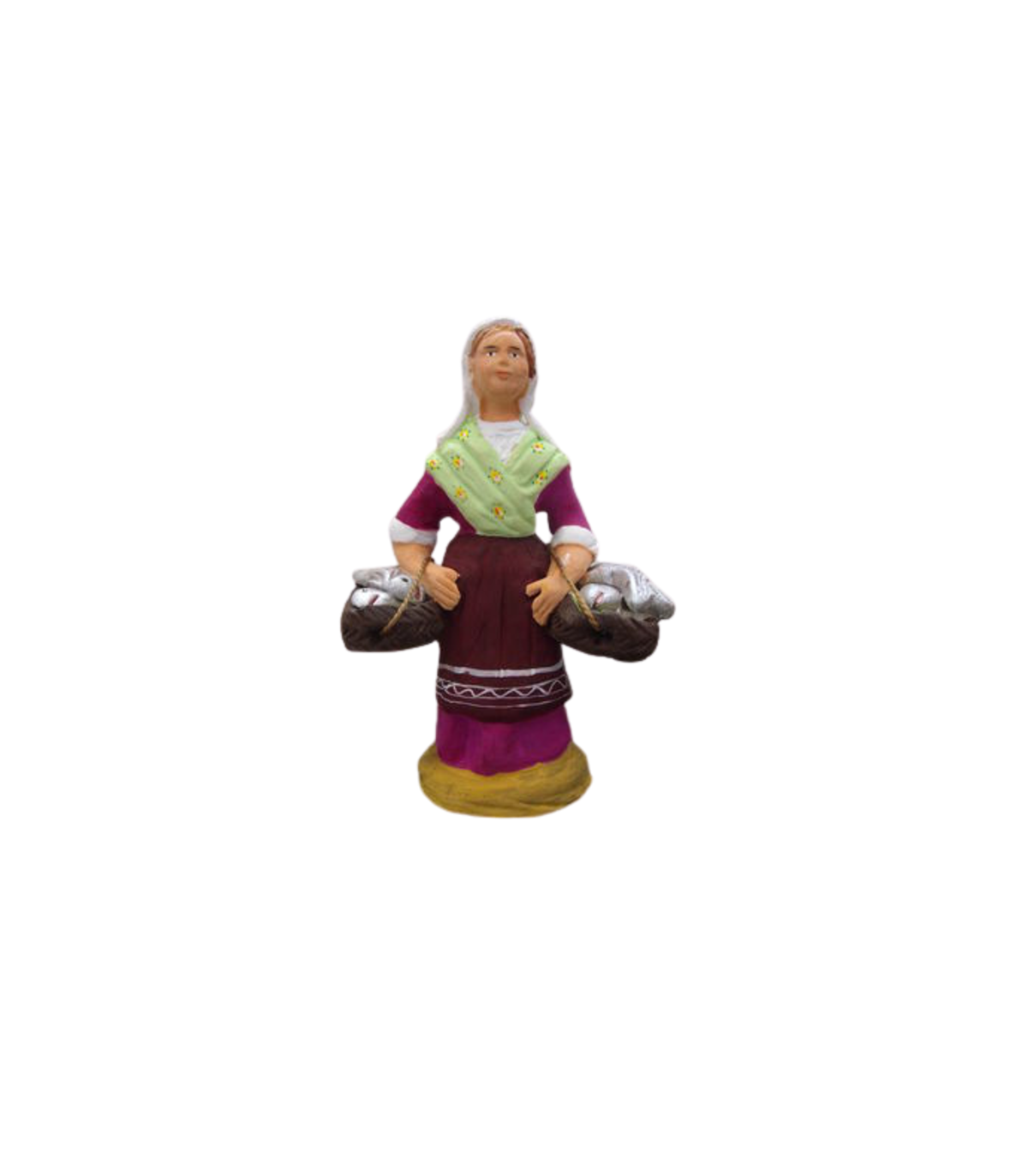 Ce santon appartient à un ensemble exceptionnel de crèche provençale entièrement fait par les dominicaines du monastère de Saint Maximin. Les personnages sont peints à la main à la gouache et les décors s'inspirent de vrais tissus provençaux.