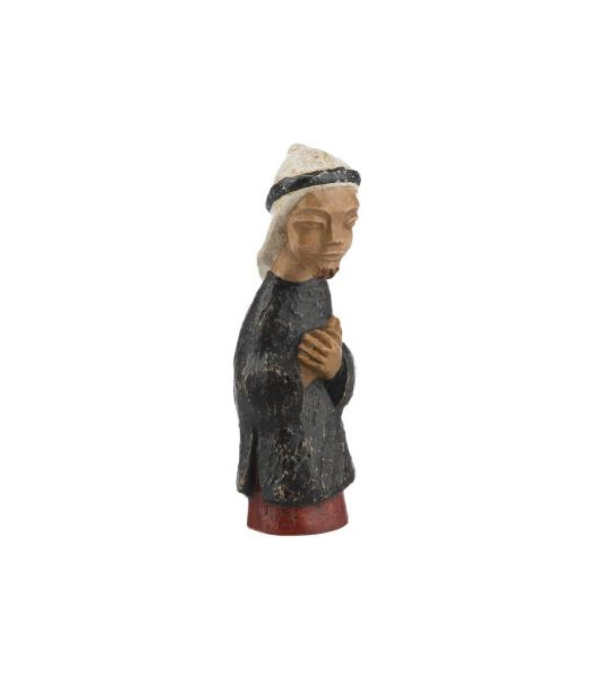 Gaspard, le roi mage chinois, en dolomie. C'est dans l'Evangile de Matthieu que l'on trouve le récit de l'Epiphanie. Les mages ont été guidés par une étoile jusque vers l'Enfant Jésus Sauveur du Monde. On y lit qu'ils offrirent de l'or, de l'encens et de la myrrhe et la tradition populaire en a déduit qu'ils étaient trois. Cette même tradition nous dit que les mages représentent tous les peuples de la terre pour qui Jésus est né ainsi que les trois âges de la vie (la jeunesse, l'âge mûr et la vieillesse). Le premier, Melchior, mage africain, représente la vieillesse, et offrit de l'or, signe le la royauté du Christ. Le second, Gaspard, en provenance de l'Asie, représente la jeunesse, et offrit de l'encens, signe de la divinité du Christ Le troisième, Balthazar, viendrait d'Occident, représente l'âge mûr, offre de la myrrhe, rappelant ainsi que le Fils de Dieu devait mourir.