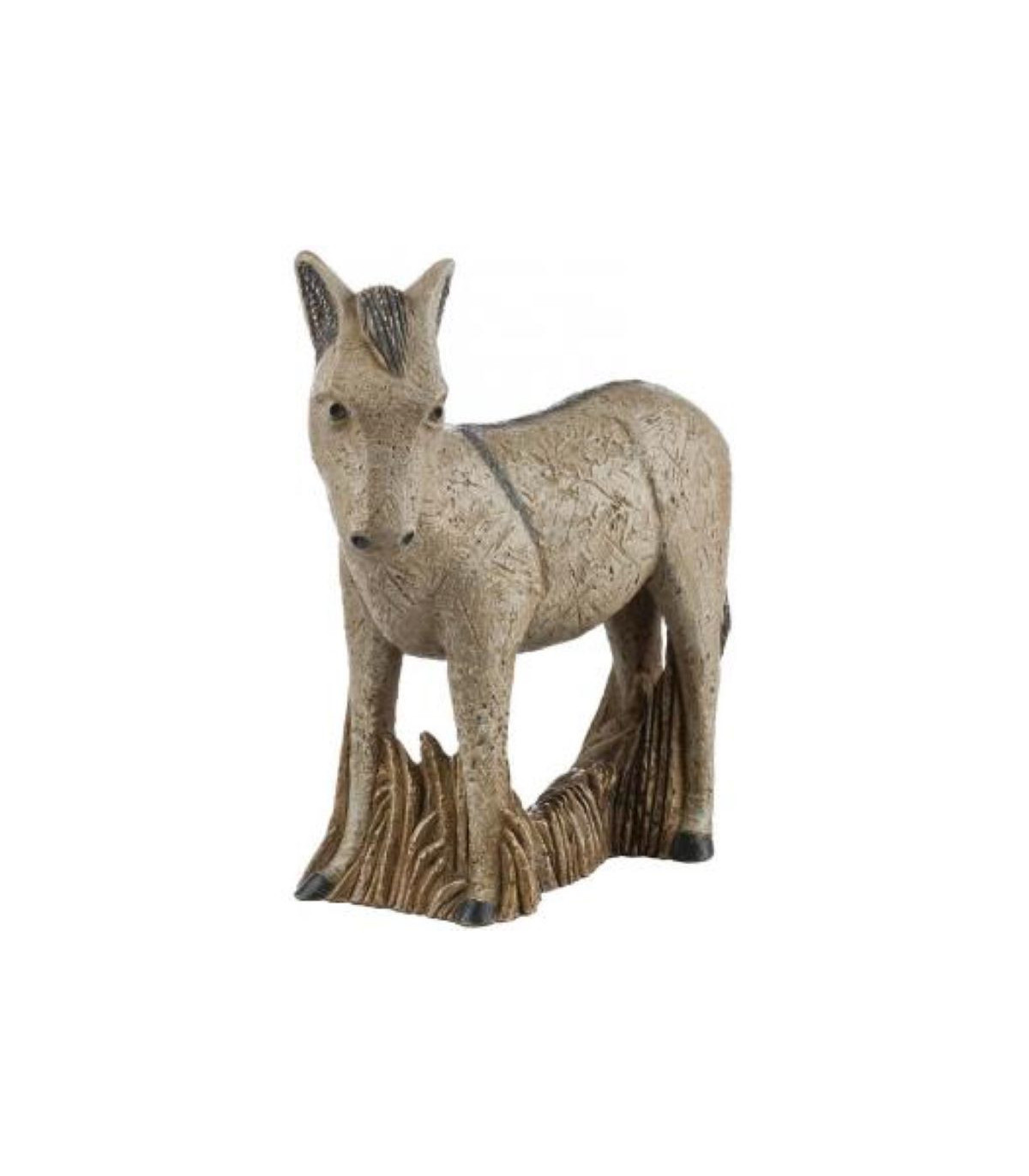 Ane de crèche debout. Les animaux de la crèche ont été les premiers témoins de la naissance du Christ. Il est souvent dit que le souffle de l'âne et du bœuf servait à réchauffer l'enfant Jésus dans l'étable. Aussi, selon une distinction importante sur les animaux, le bœuf représenterait Israël (animal pur), et l'âne représenterait les païens (animal impur). La crèche est une tradition de Noël, représentant la naissance du Christ. Cette tradition a été instaurée au XIIIème siècle, par Saint François d'Assise, lorsque celui-ci mit en place une crèche vivante dans une grotte de Greccio.