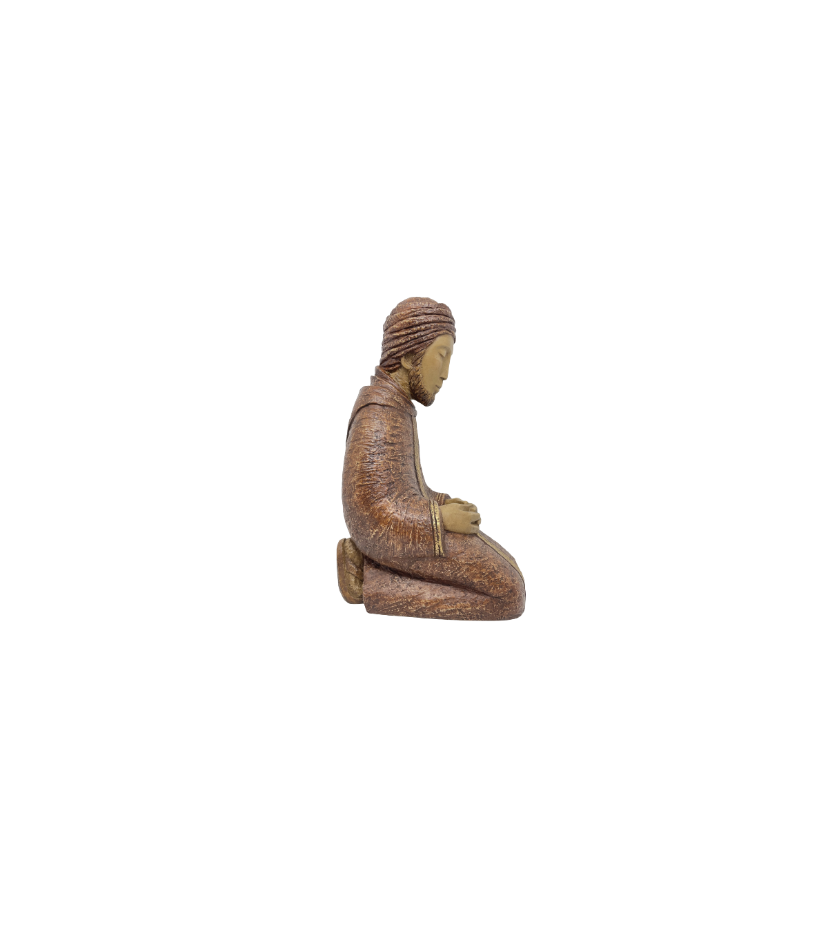 Saint-Joseph à genoux, en dolomie. Joseph représente le père de la Sainte Famille. Au premier abord, Joseph apparaît comme un personnage effacé dans la crèche. Mais au contraire, il possède un rôle essentiel. Il est définit "d'homme juste" et "celui qui ne dit mot" selon Saint Matthieu dans l'Evangile. C'est un homme qui incarne la discrétion et la protection. La crèche est une tradition de Noël, représentant la naissance du Christ. Cette tradition a été instaurée au XIIIème siècle, par Saint François d'Assise, lorsque celui-ci mit en place une crèche vivante dans une grotte de Greccio.