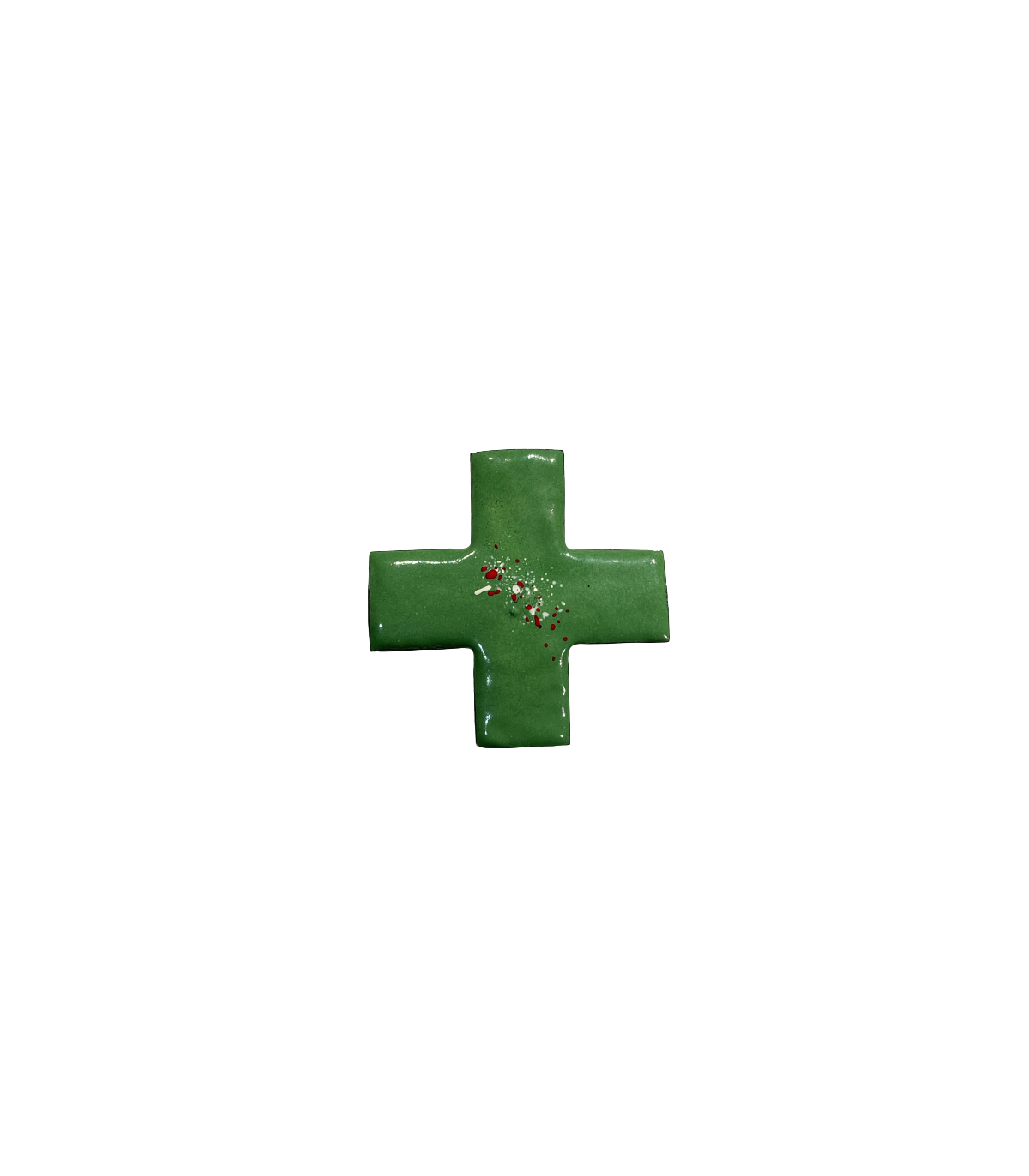 Croix grecque "Force de l'espérance" émaillée verte 7,5*7,5cm, munie d'une attache au dos pour l'accrocher.