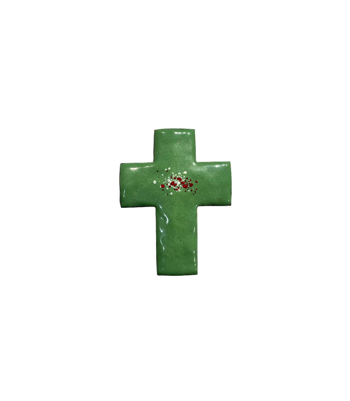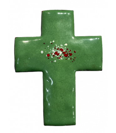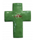 Croix latine émaillée verte 6,5*8,5cm, munie d'une attache au dos pour l'accrocher.