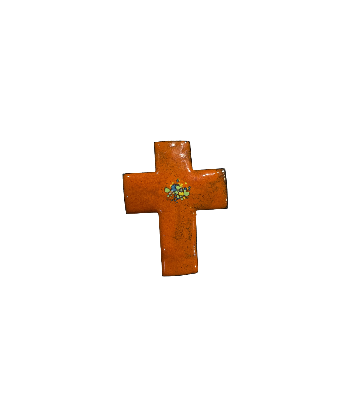 Croix latine "Vive flamme d'amour" émaillée orange 6,5*8,5cm, munie d'une attache au dos pour l'accrocher.