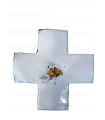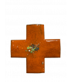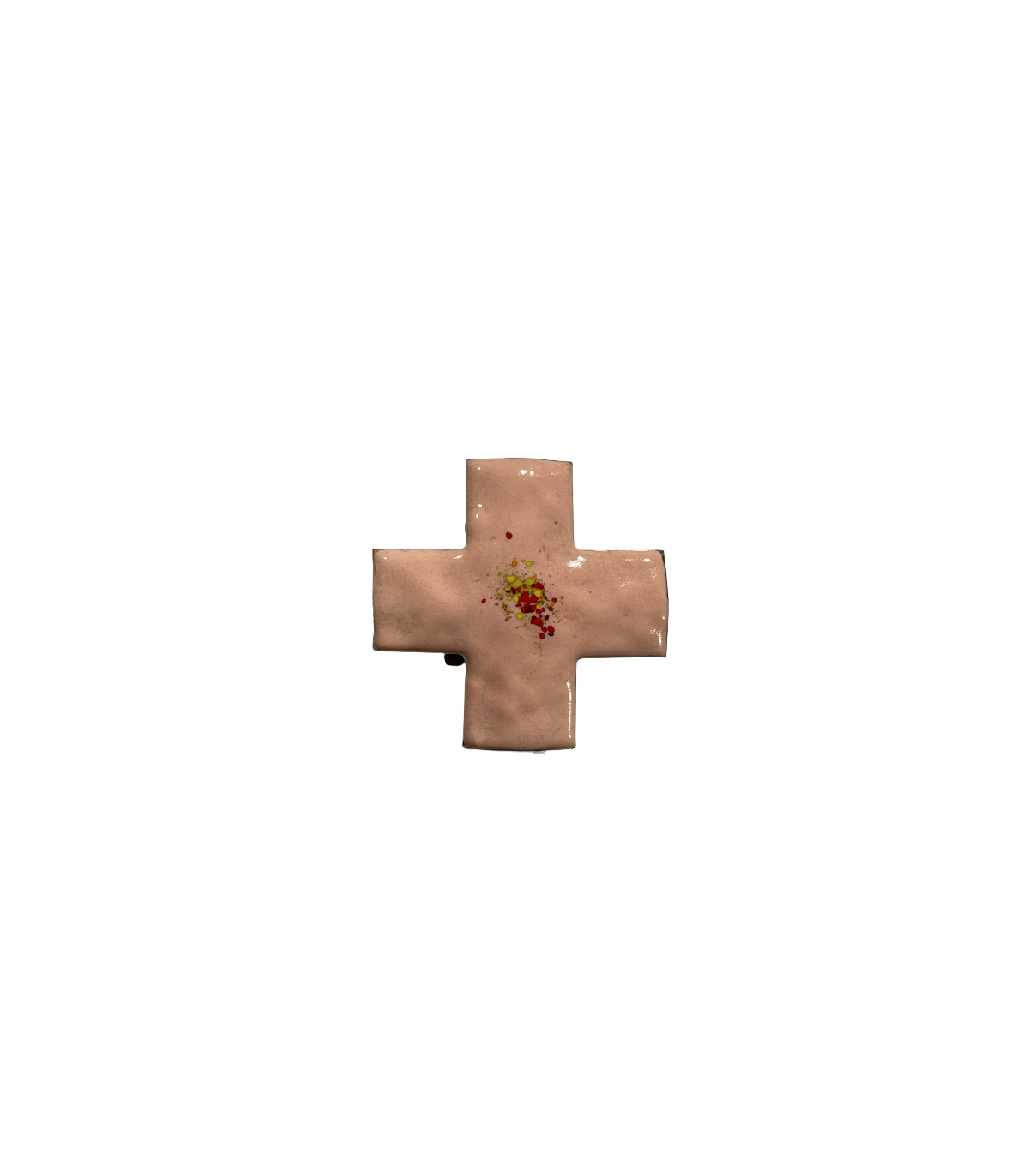 Croix grecque "Béatitudes" émaillée rose 7,5*7,5cm, munie d'une attache au dos pour l'accrocher.
