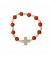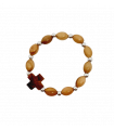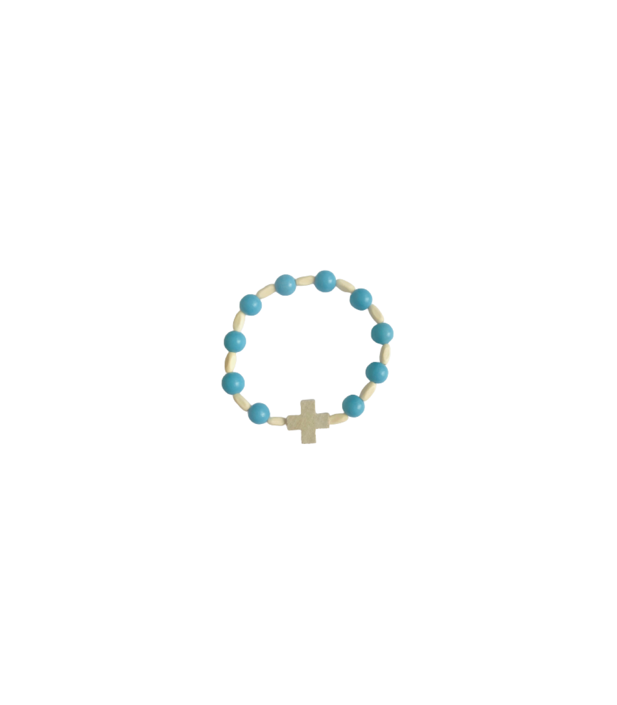 Chapelet en bois bleu avec une petite croix et des nœuds en blanc