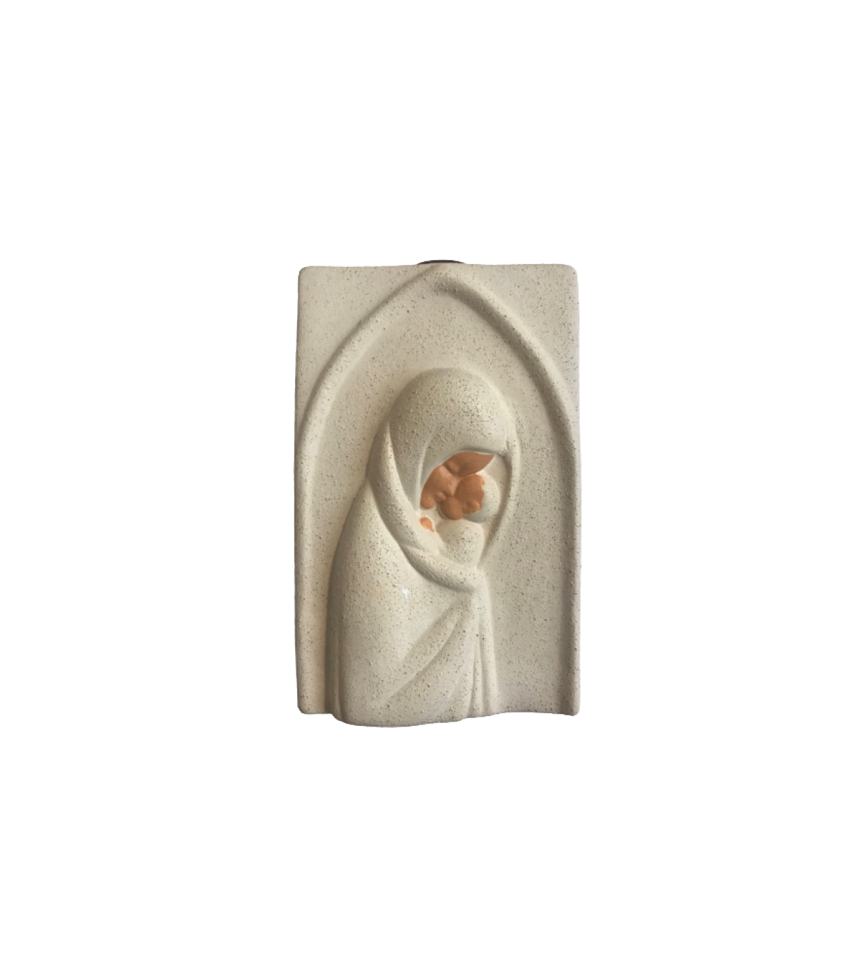 Haut relief en terre cuite chamottée de Notre Dame à l'enfant à accrocher au dessus du berceau.