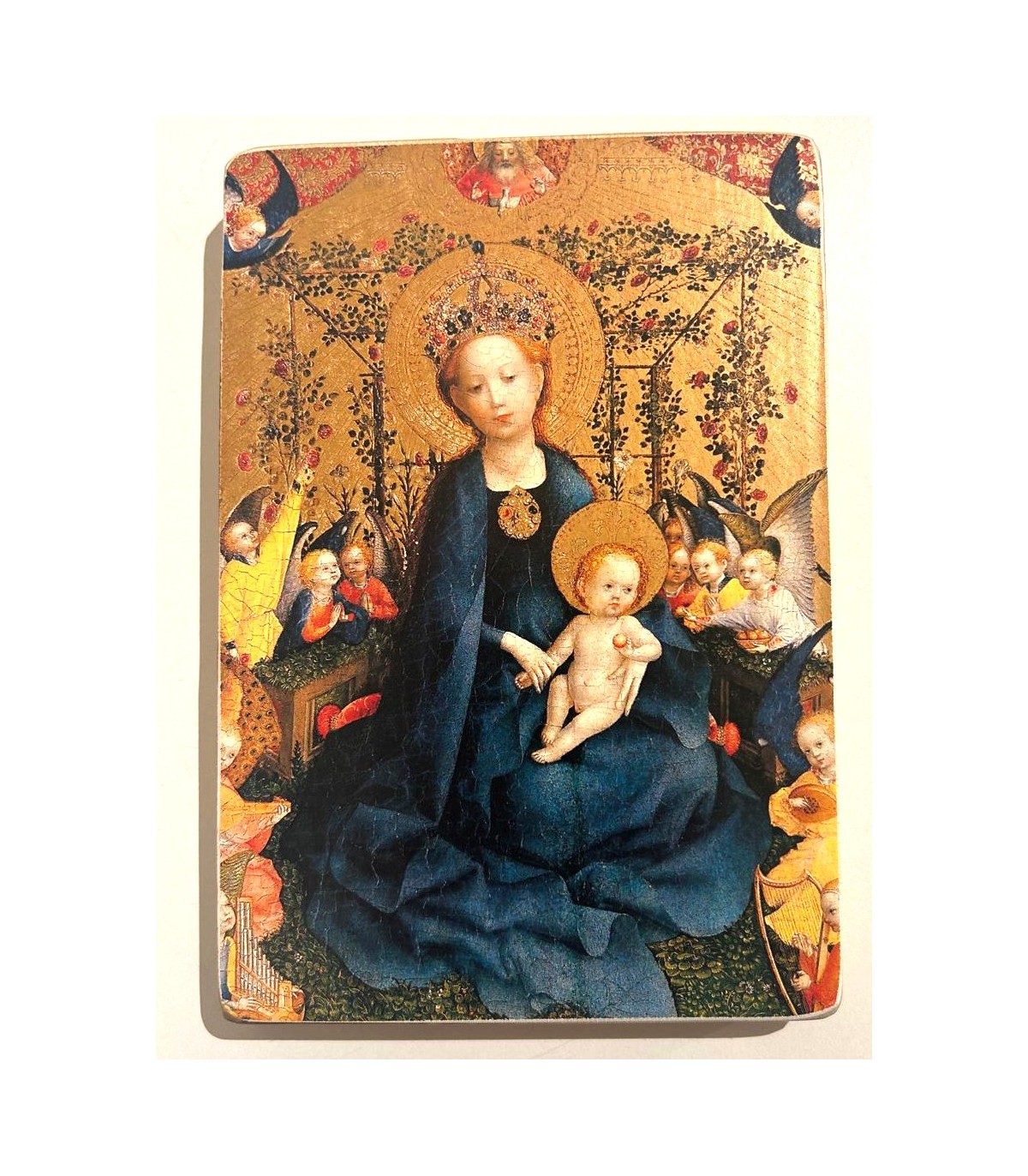 Elle représente ainsi la Vierge de l'humilité. Chaque icone est collée à la main sur du bois massif. Les soeurs les patinent ensuite à la cire.