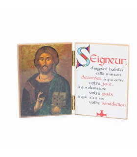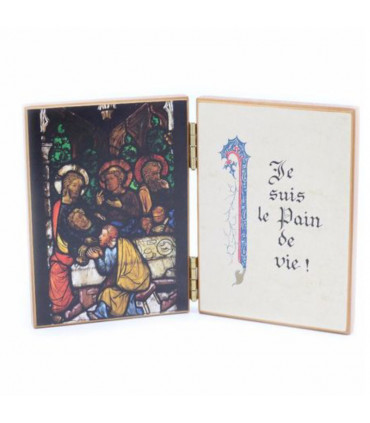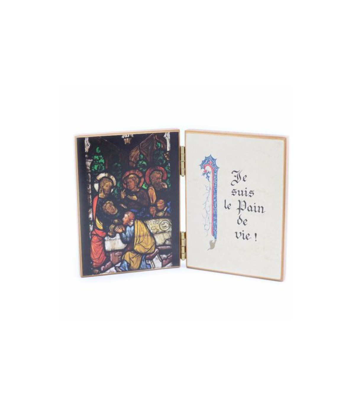 Diptyque Le Christ - La Dernière Cène sur bois de merisier. Cette icône invite à la méditation par l'image et le texte grâce à ses deux faces complémentaires. Fermé : Longueur 10,5 cm Hauteur 14,5 cm Ouvert : Longueur 21,5 cm Hauteur 14,5 cm Fabriqué à la main par les bénédictins de l'Abbaye de St Jopseh de Clairval à Favigny.