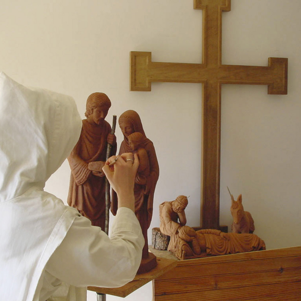 Ce travail statuaire, inspiré de l’art ancien et des techniques artisanales traditionnelles, est réalisé dans la prière et l’humble recherche d’une Beauté tout Autre, celle du Dieu vivant.