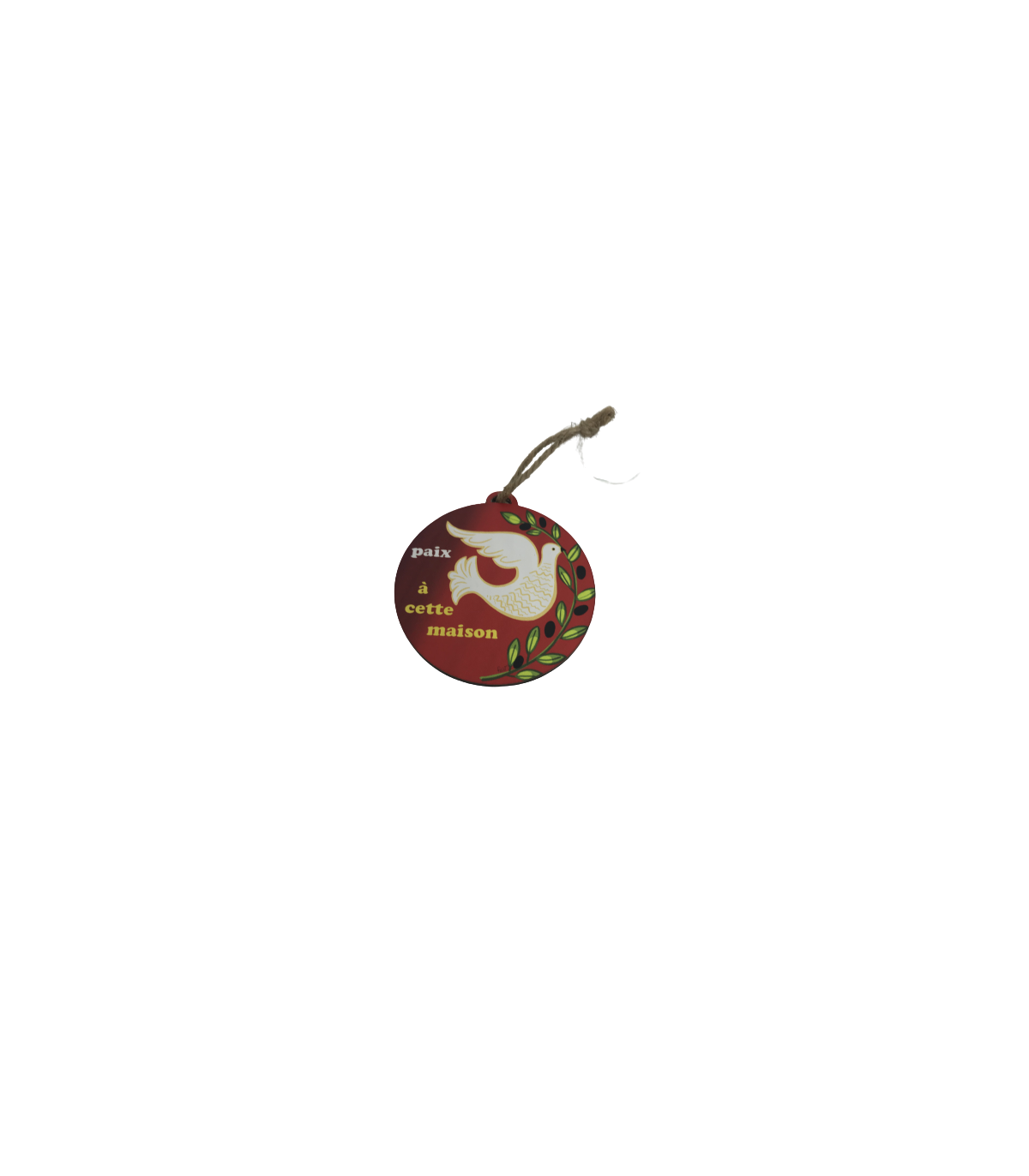 Voici une boule de noël que vous pourrez accrocher à votre sapin en ces temps de fêtes et de joie. Le recto ainsi que le verso montrent Le message de la Paix. Dimensions : 7.5cm x 7.5cm Epaisseur : 3mm Produit créé par les Bénédictines de Venière.