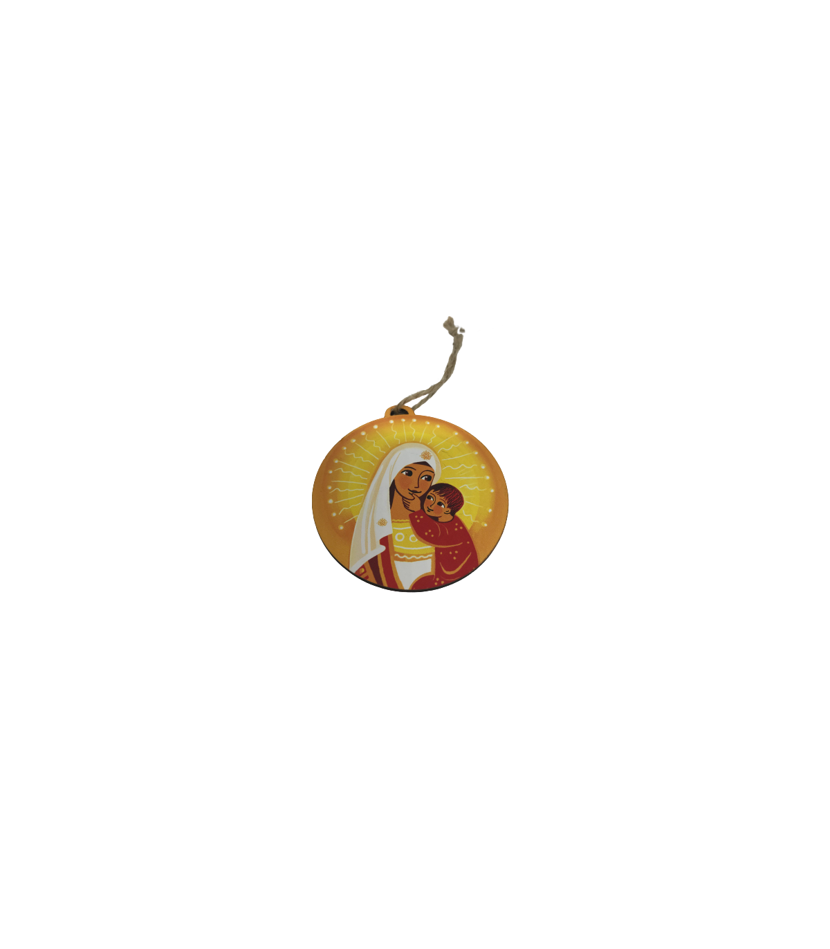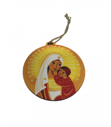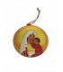 Voici une boule de noël que vous pourrez accrocher à votre sapin en ces temps de fêtes et de joie. Le recto ainsi que le verso montrent La Vierge à l'enfant. Dimensions : 7.5cm x 7.5cm Epaisseur : 3mm Produit créé par les Bénédictines de Venière.