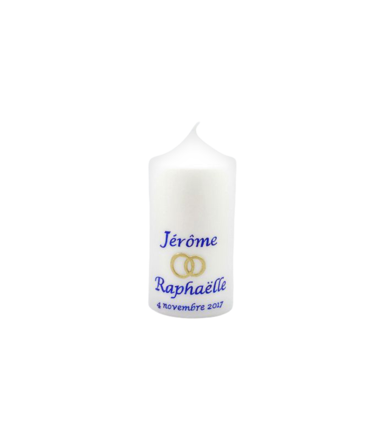 Apportez une touche décorative et symbolique à votre cérémonie de mariage avec nos bougies de mariage personnalisables sur lesquelles sont inscrits les prénoms des mariés, la date du mariage et les anneaux dorés.