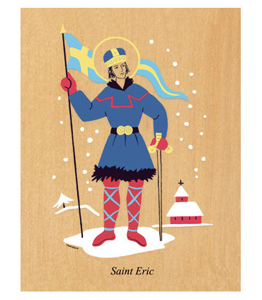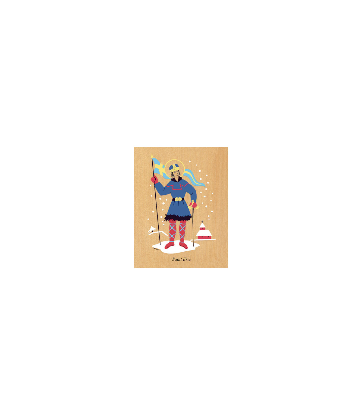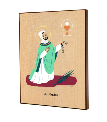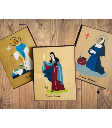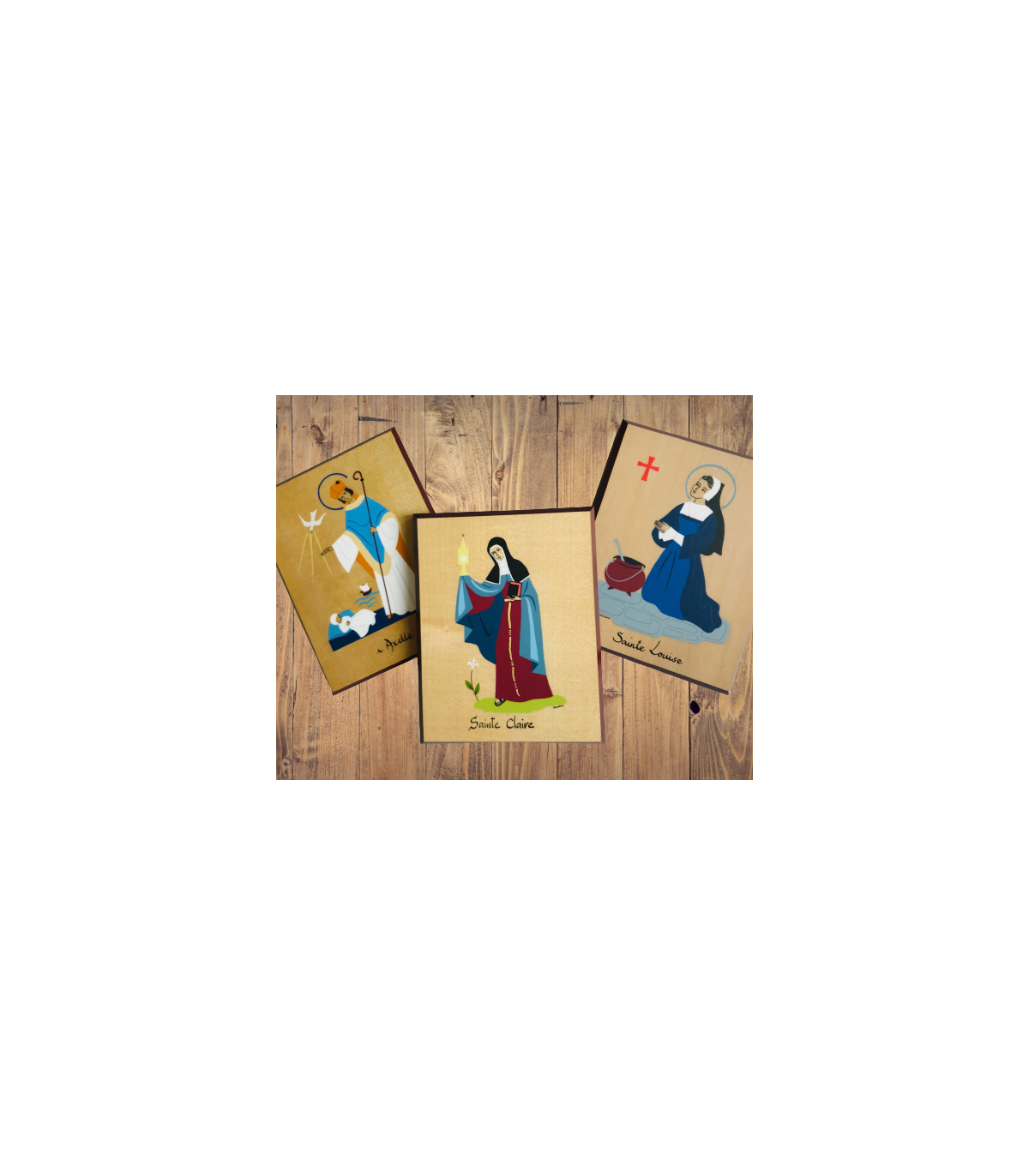 Saint Patron en laminage sur bois mélaminé. Le dessin créé par les Bénédictines respecte les détails hagiographiques de la vie du Saint.