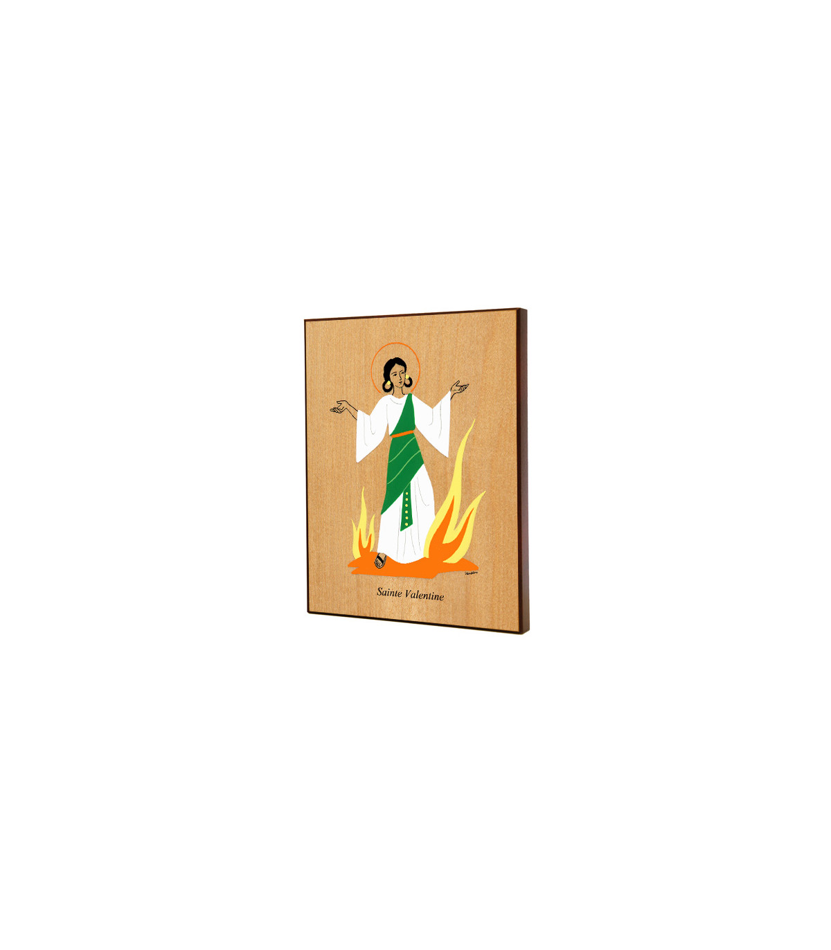 Saint Patron en laminage sur bois avec des encres garanties longue durée, finition acajou, protection anti-uv.
