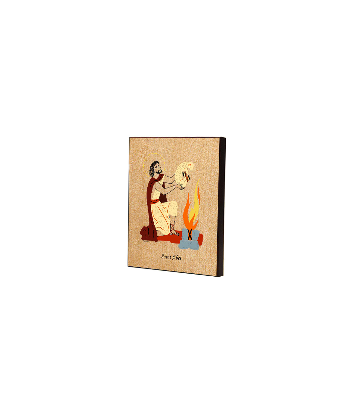 Saint Patron en laminage sur bois avec des encres garanties longue durée, finition acajou, protection anti-uv.