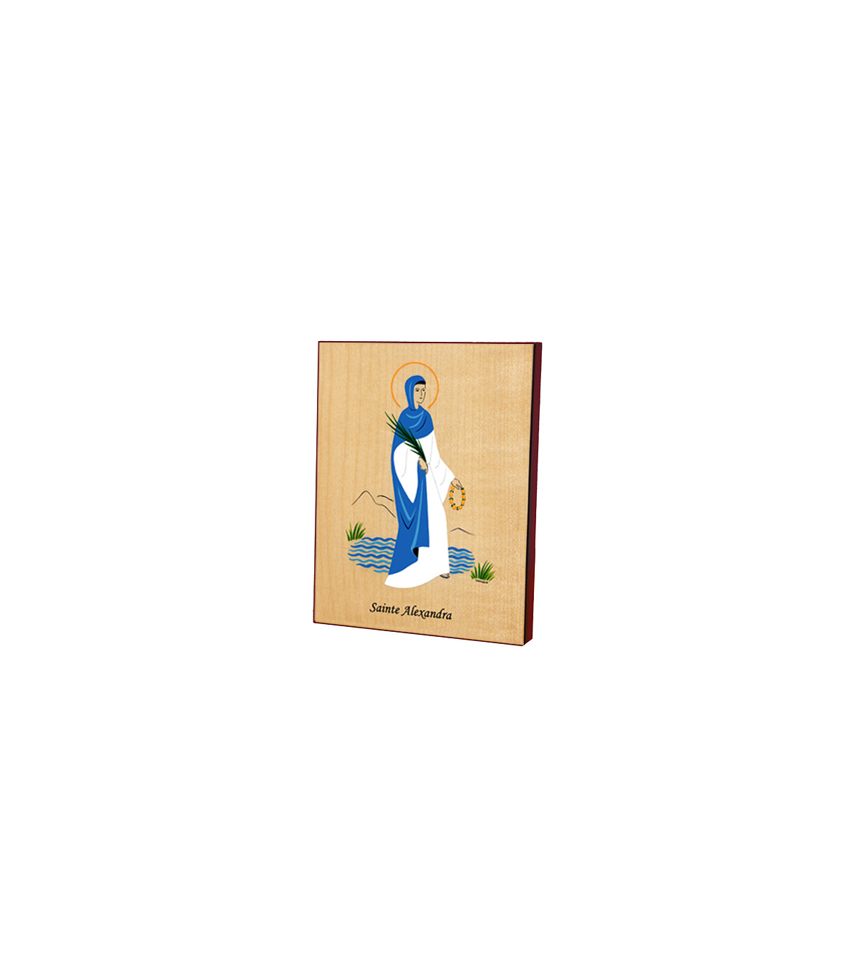 Saint Patron en laminage sur bois avec des encres garanties longue durée, finition acajou, protection anti-uv.