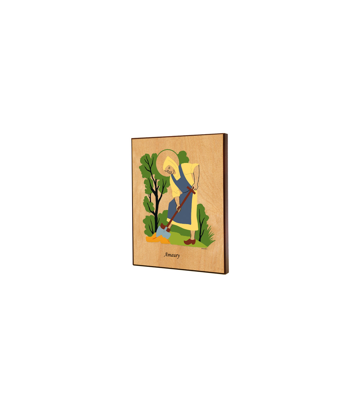 Saint Patron en laminage sur bois avec des encres garanties longue durée, finition acajou, protection anti-uv.