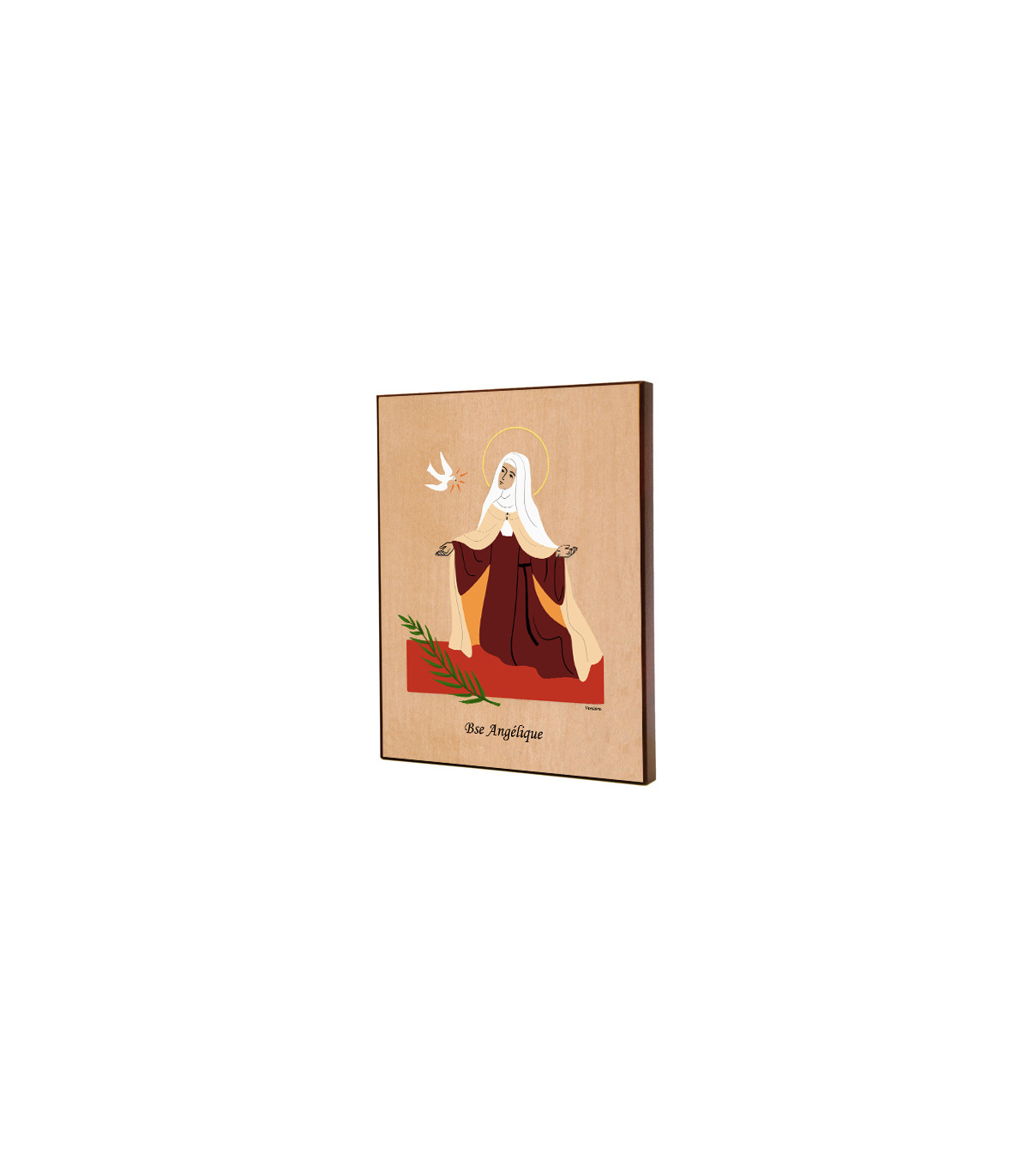Saint Patron en laminage sur bois avec des encres garanties longue durée, finition acajou, protection anti-uv.