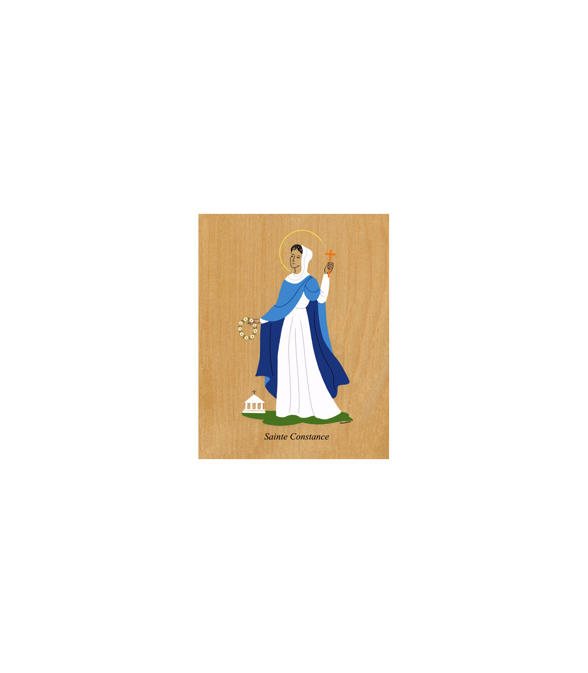Saint Patron en laminage sur bois avec des encres garanties longue durée, finition acajou, protection anti-uv.