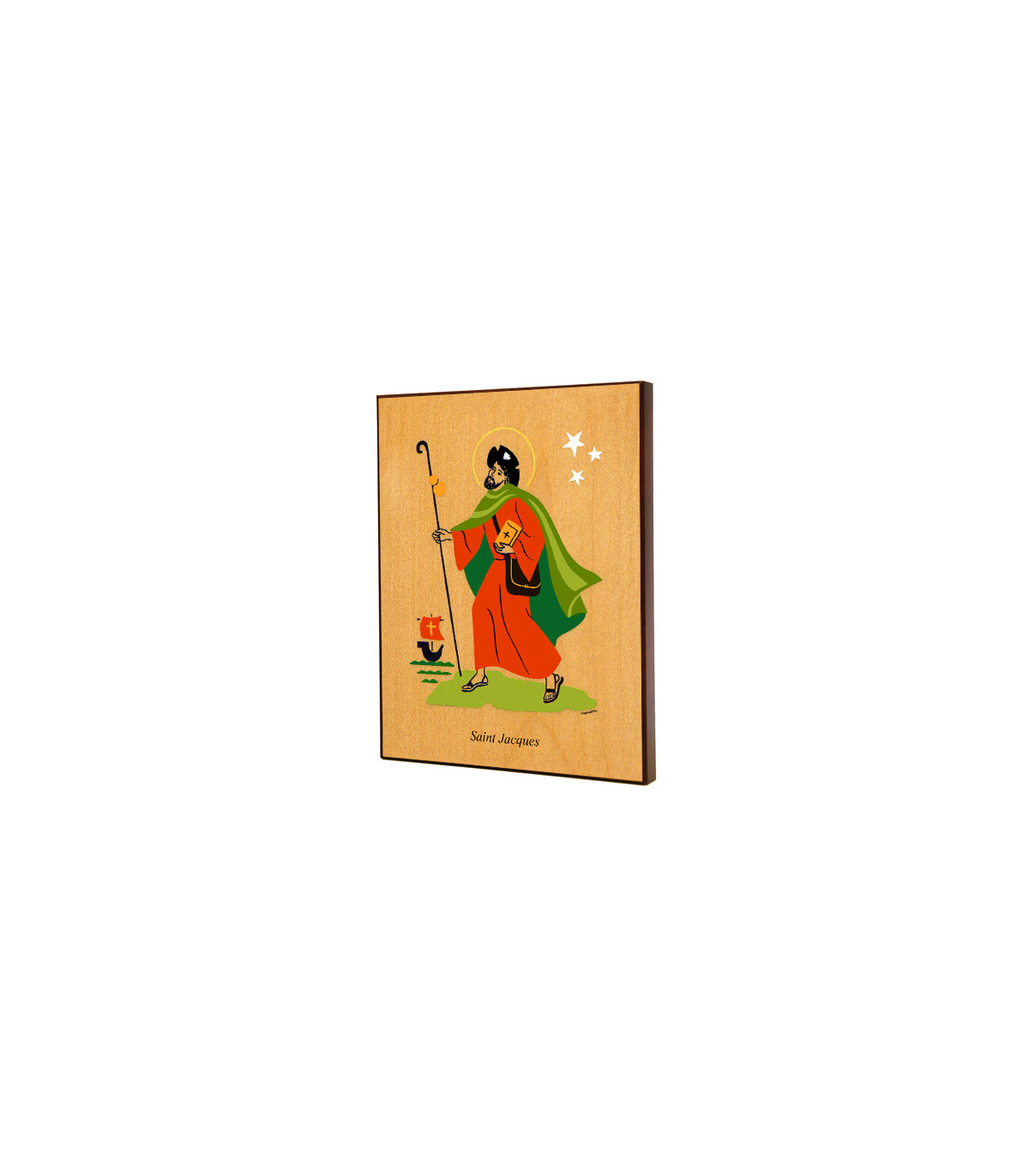 Saint Patron en laminage sur bois avec des encres garanties longue durée, finition acajou, protection anti-uv.