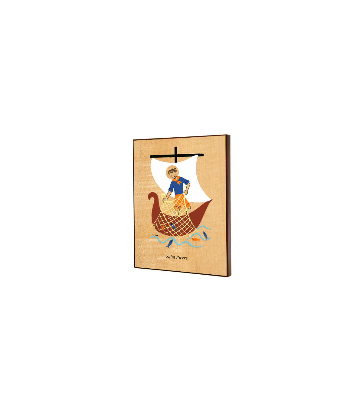 Saint Patron en laminage sur bois avec des encres garanties longue durée, finition acajou, protection anti-uv.