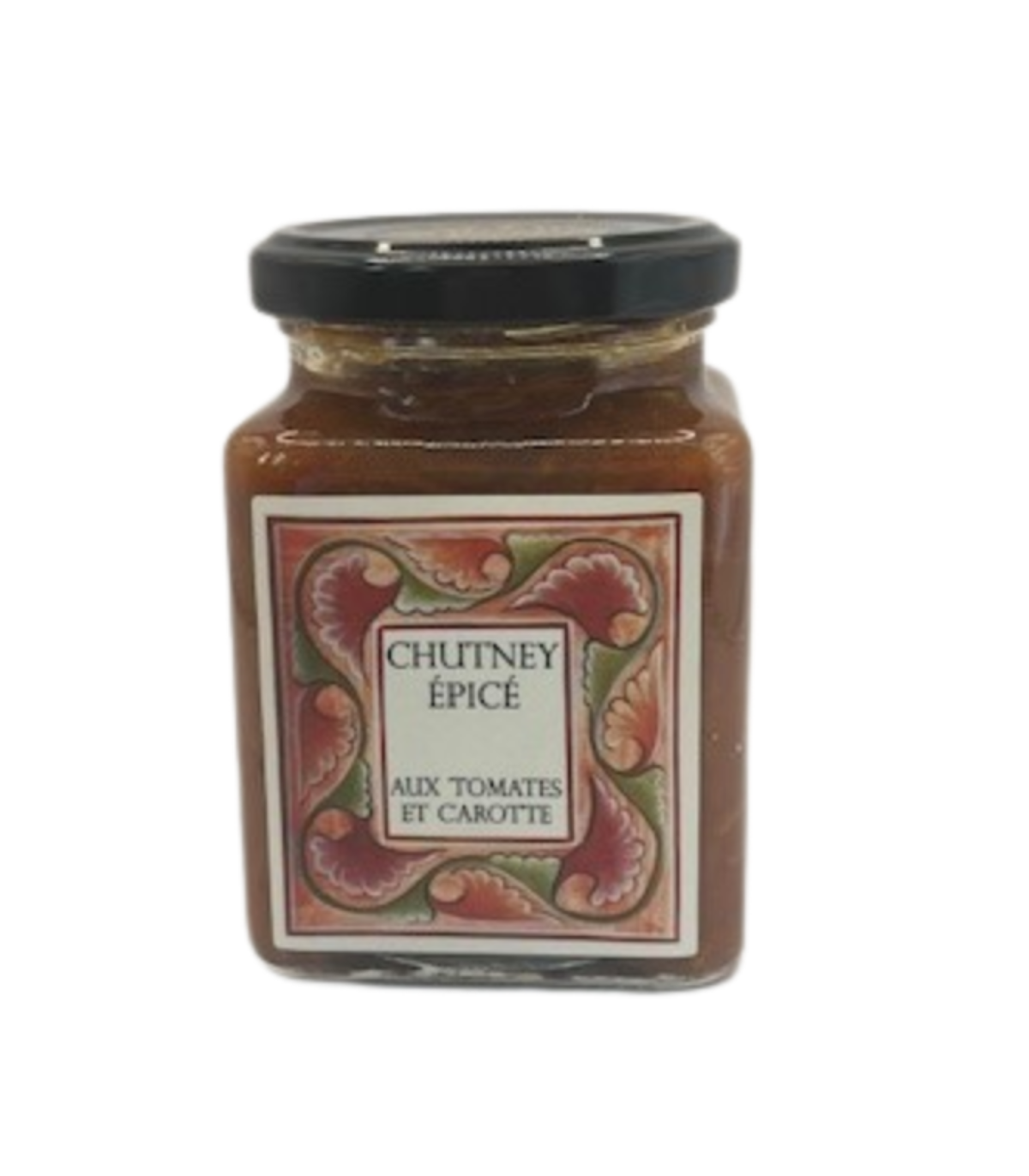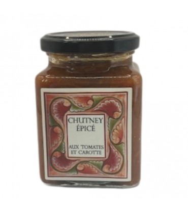 Ingrédients : tomates (60%), vinaigre, oignons, carottes (8%), sucre, huile d'olive, grines de moutarde, sel, épices, pectine.