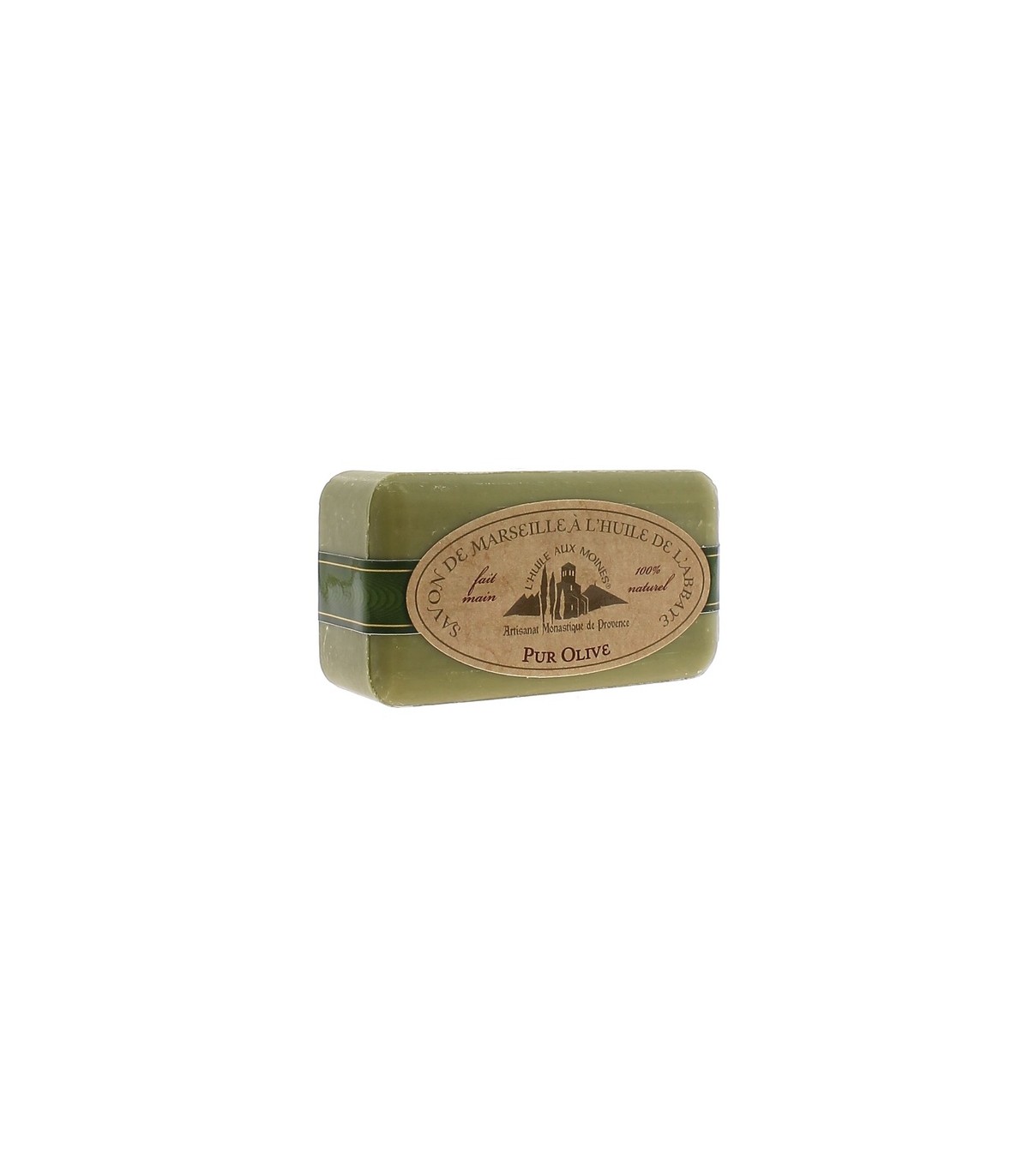 Véritable savon de Marseille à l’huile de l’Abbaye, obtenu par saponification à l’ancienne en chaudron, d’huile de grignon et d’olives.