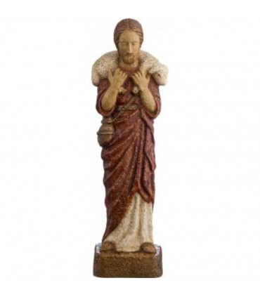 Statue polychrome du Bon Pasteur portant une brebis sur les épaules.