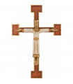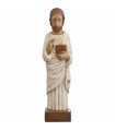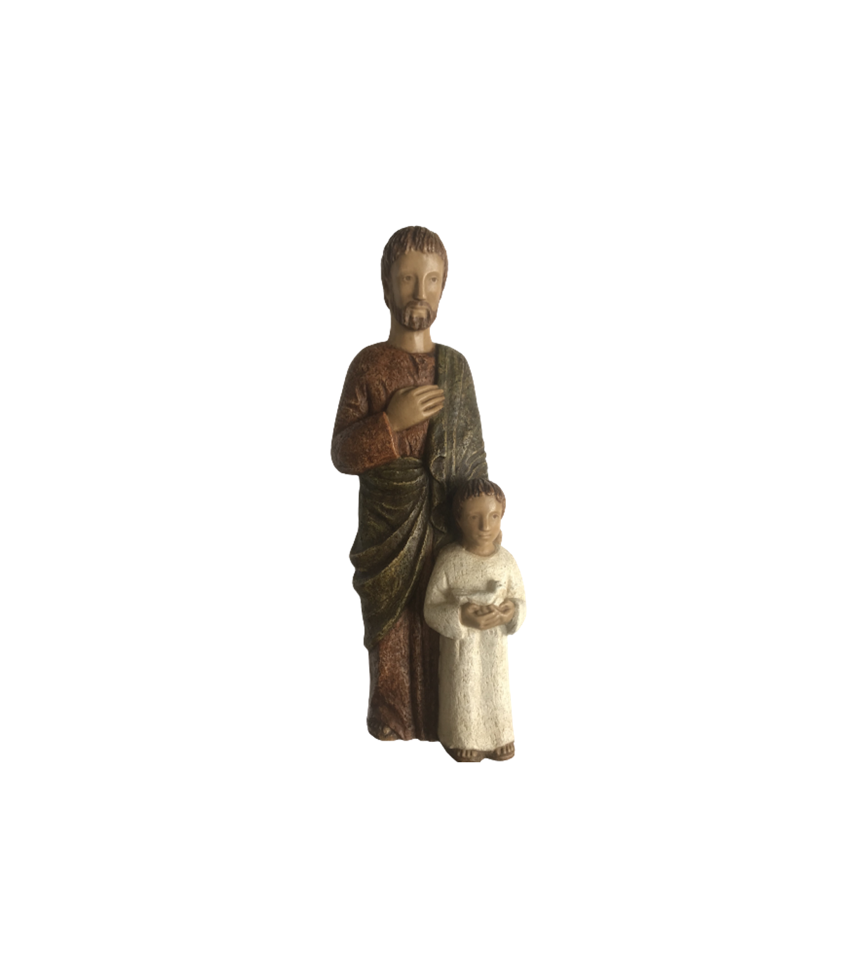 Statue de Saint Joseph aux colombes en dolomie La présence des colombes avec Saint Joseph fait allusion à l'Evangile de Luc : "Quand fut accompli le temps prescrit par la loi de Moïse pour la purification, les parents de Jésus l’amenèrent à Jérusalem pour le présenter au Seigneur, selon ce qui est écrit dans la Loi : Tout premier-né de sexe masculin sera consacré au Seigneur. Ils venaient aussi offrir le sacrifice prescrit par la loi du Seigneur : un couple de tourterelles ou deux petites colombes." Hauteur : 25 cm - dolomie vert et rouge