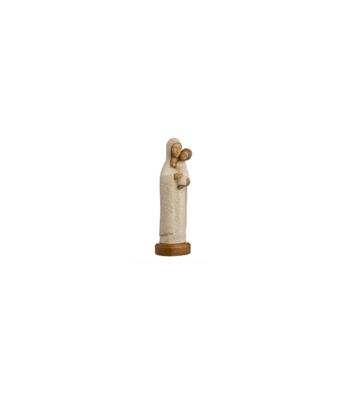 Statue de la Vierge Eleousa en dolomie, manteau blanc. C'est une Madone maternelle. La Vierge Marie est représentée avec l'Enfant Jésus dans ses bras appuyant sa joue contre celle de sa mère. Le rapprochement du visage de la Vierge Marie et de celui de l'Enfant Jésus symbolise l'Amour infini. Cet amour infini, comme celui du sacrifice du Christ sur la Croix, est l'expression la plus élevée de son amour pour l'humanité. La Vierge pressent le martyre de son fils et le serre dans ses bras. Celui-ci lui tend la joue pour la consoler. C'est un thème profondément humain qui existe en variations infinies : celle de la tendresse d'une mère pour son enfant.