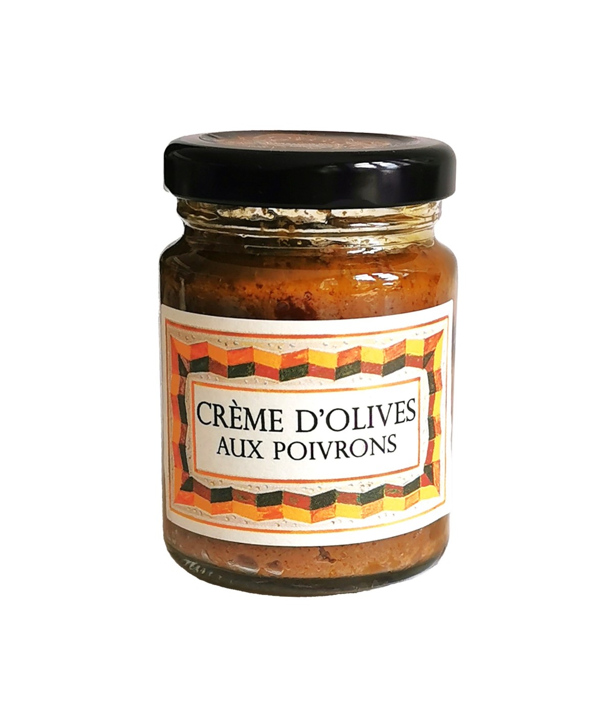 Petit pot de crème d'olives verte aux poivrons rouges.